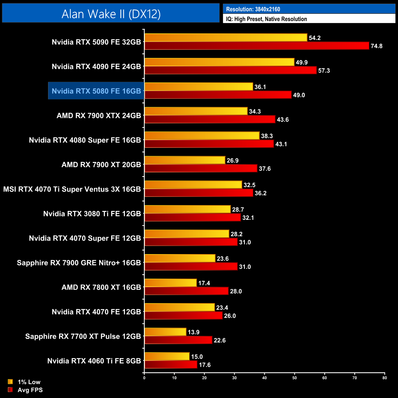 Stepping up to 4K sees the 5080 now average 49fps, giving it 12% and 14% gains over the 7900 XTX and 4080 Super, respectively. It's 15% slower than the RTX 4090, and 35% behind the RTX 5090.