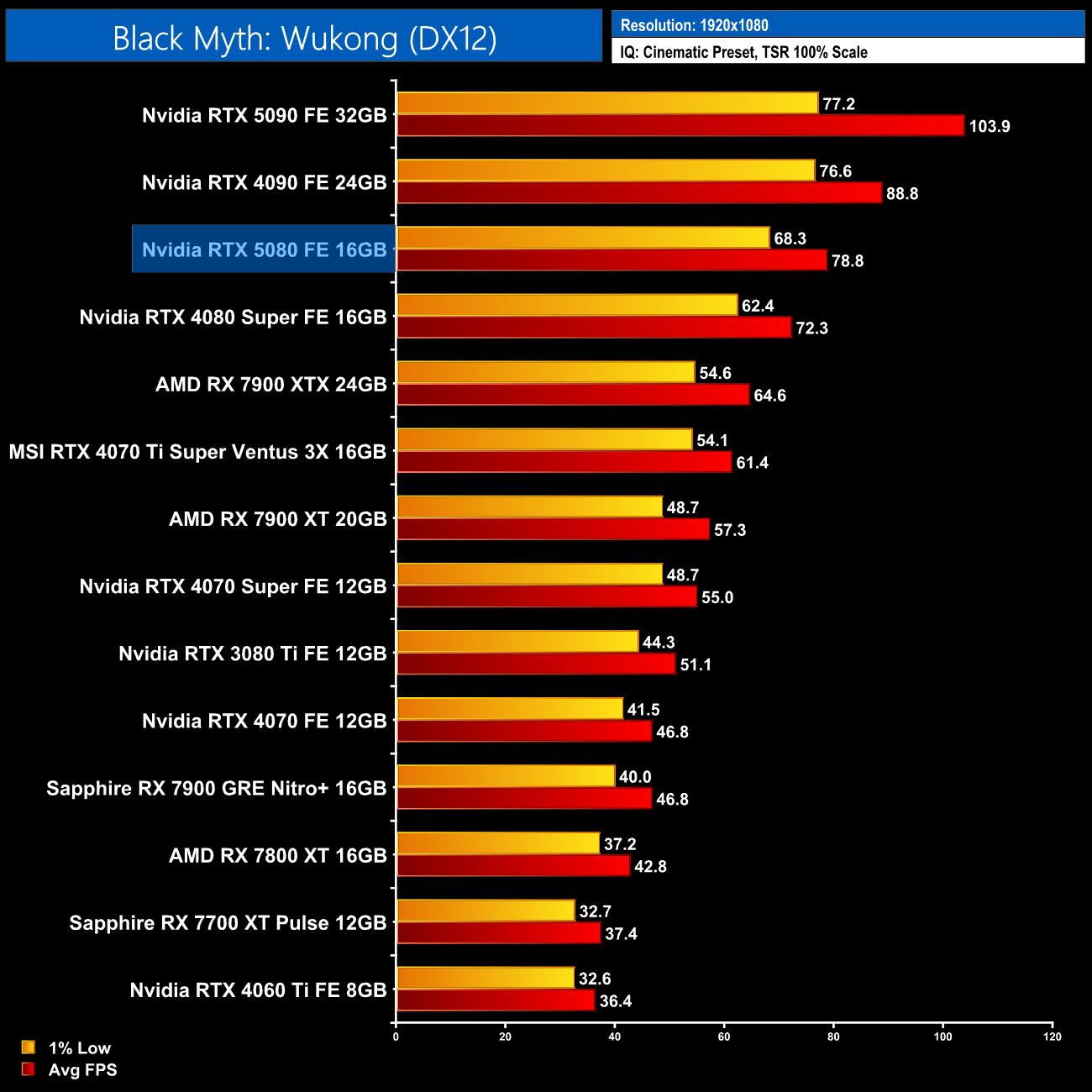Moving onto Black Myth: Wukong, at 1440p the RTX 5080 is good for 62fps on average, giving it a 12% lead over the 4080 Super. It's also 12% slower than the 4090, and 29% behind the 5090.