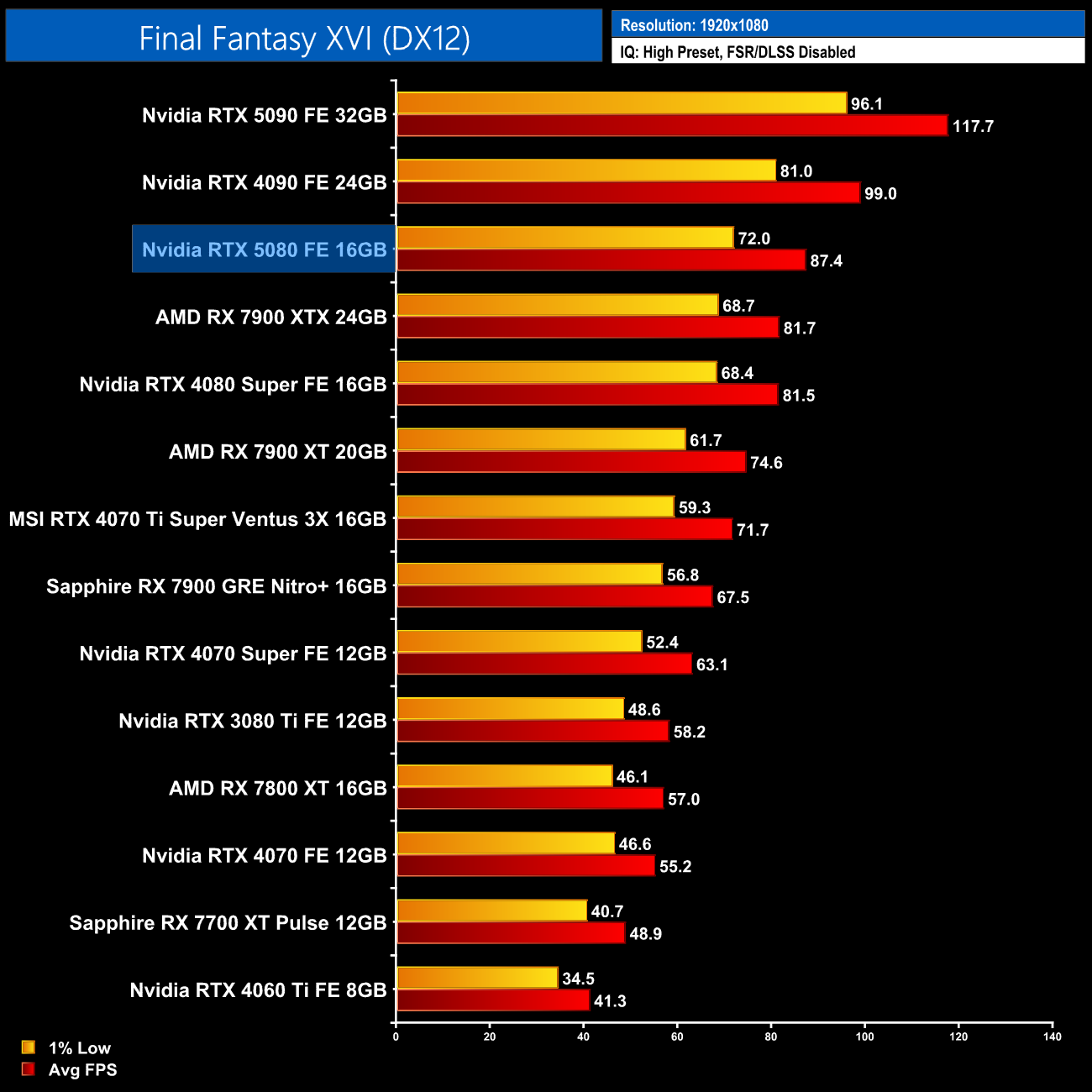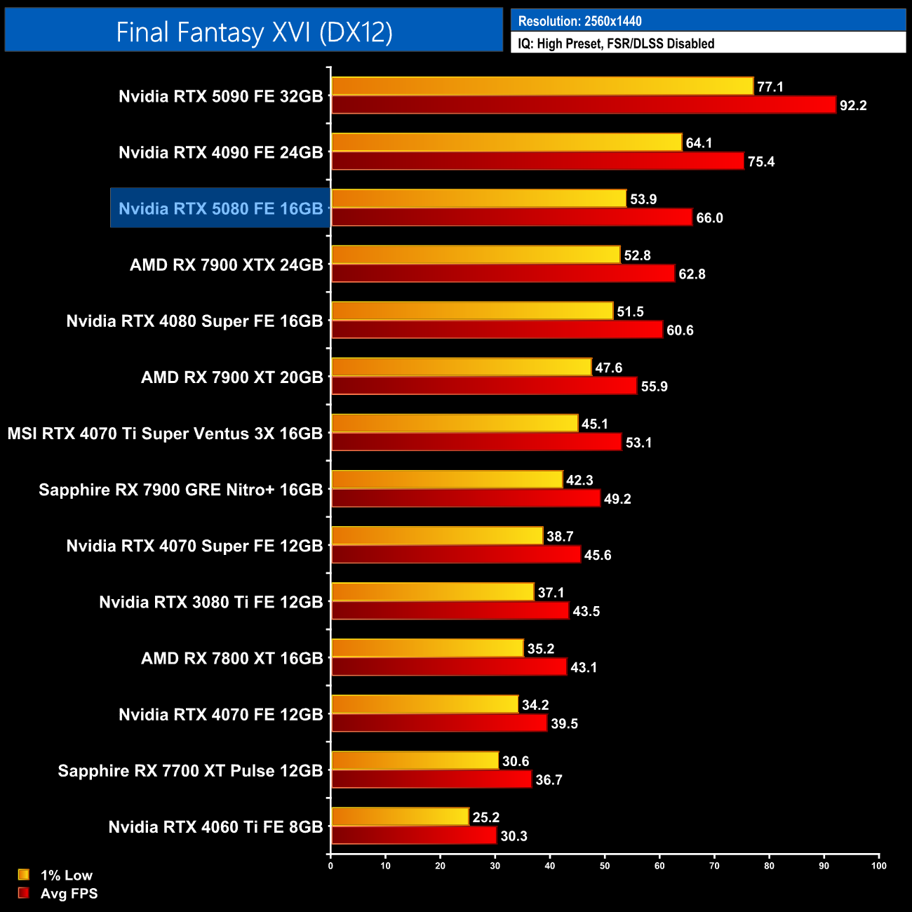 Next is Final Fantasy XVI, another very intense game, resulting in an average frame rate of just 66fps for the 5080 at 1440p. That gives it just a 5% lead over the 7900 XTX, while it's 9% faster than the 4080 Super.
