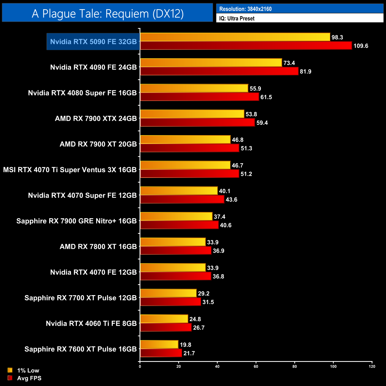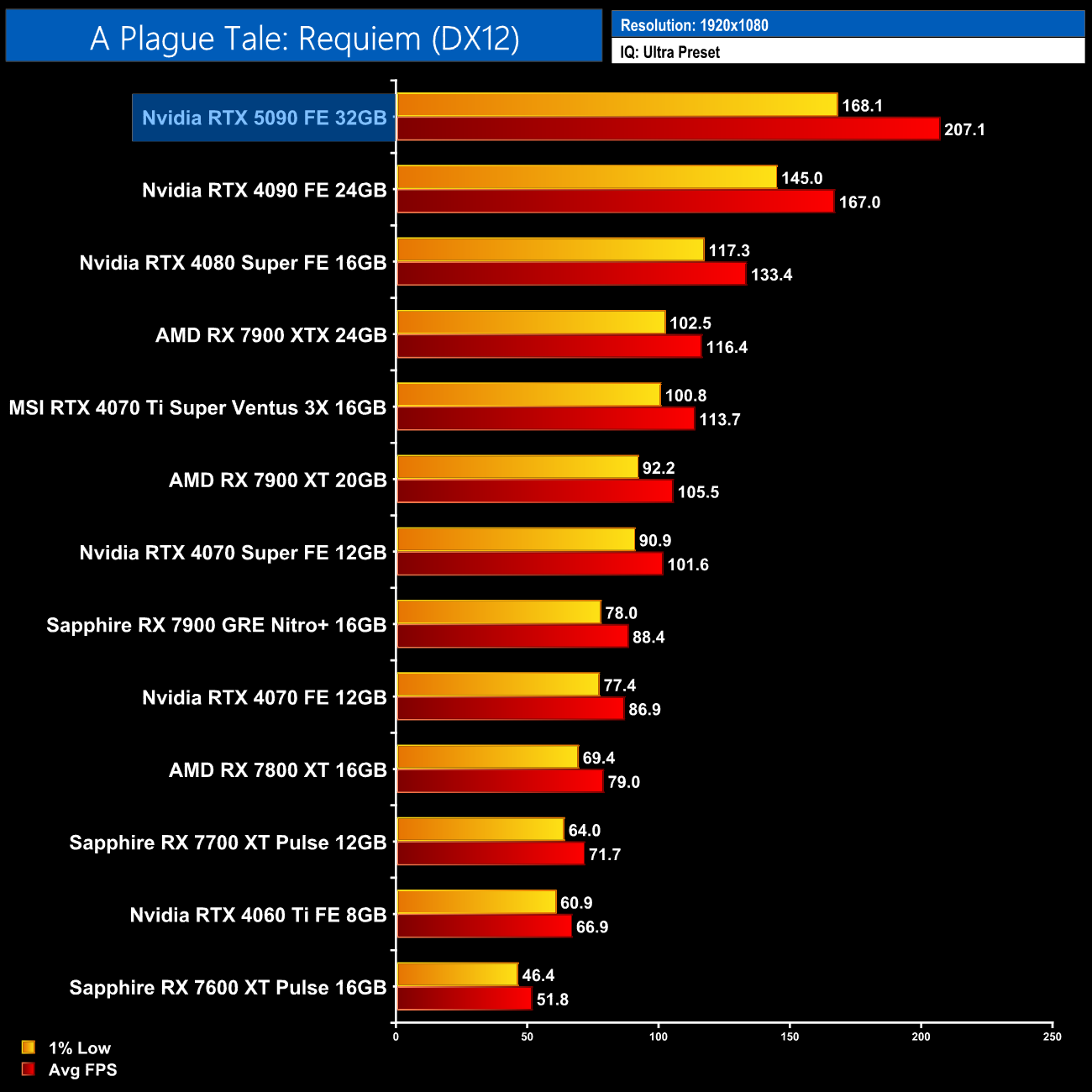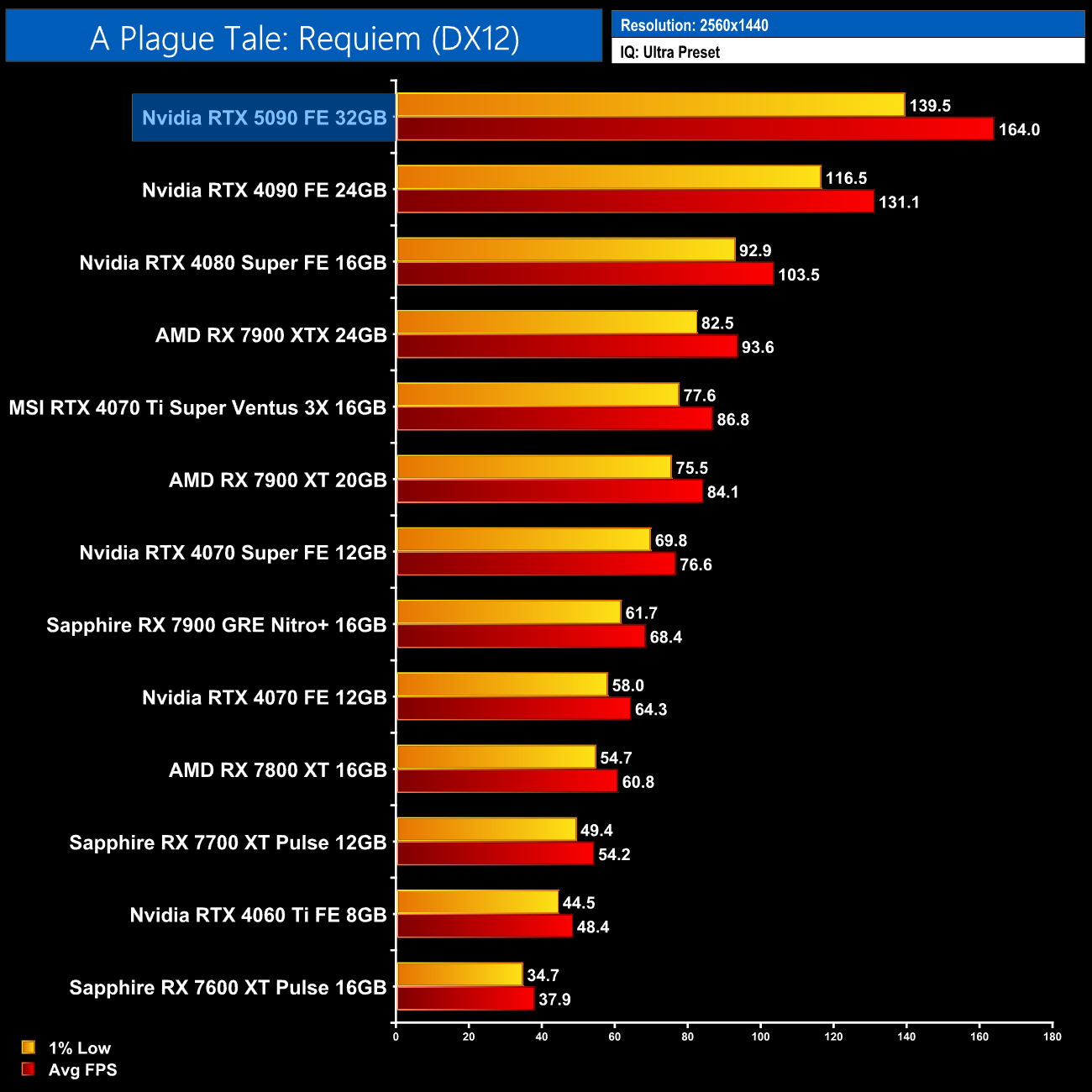 As for A Plague Tale: Requiem, the 5090 averages 164fps at 1440p, which equates to a 25% uplift over the 4090, or a 59% gain over the 4080 Super.