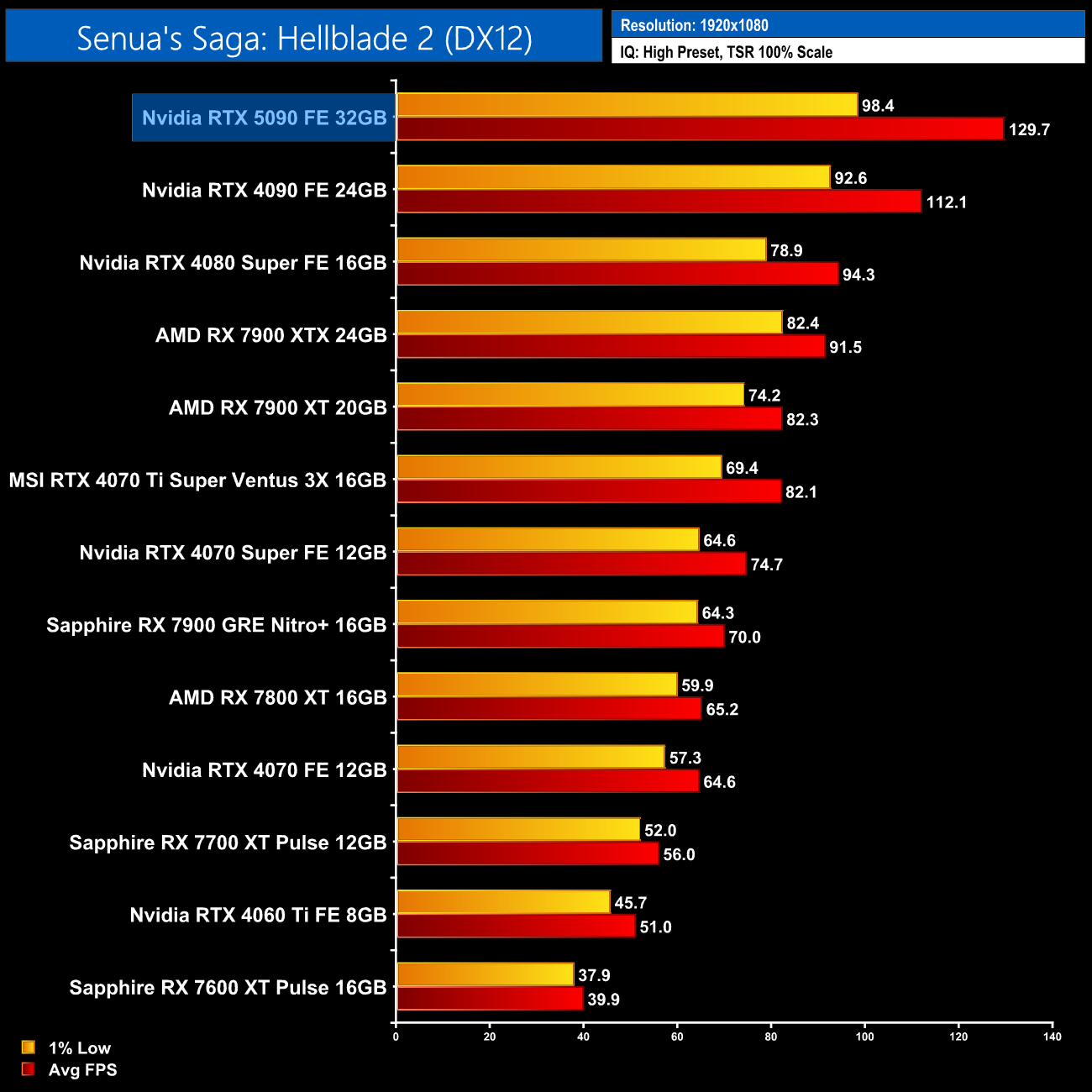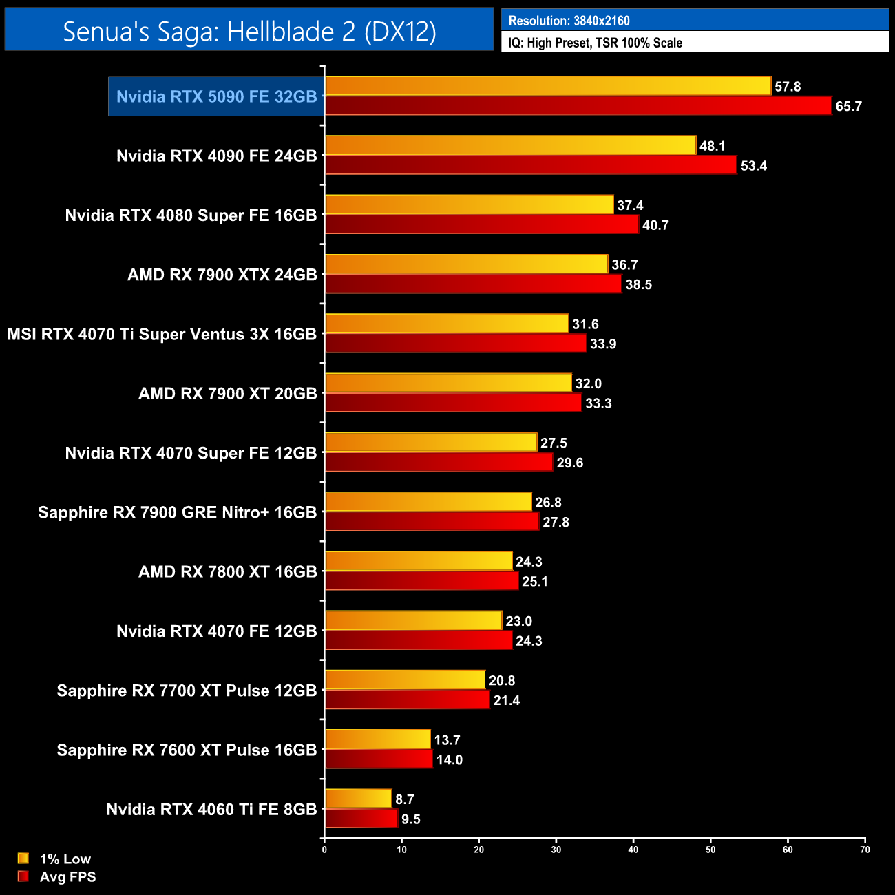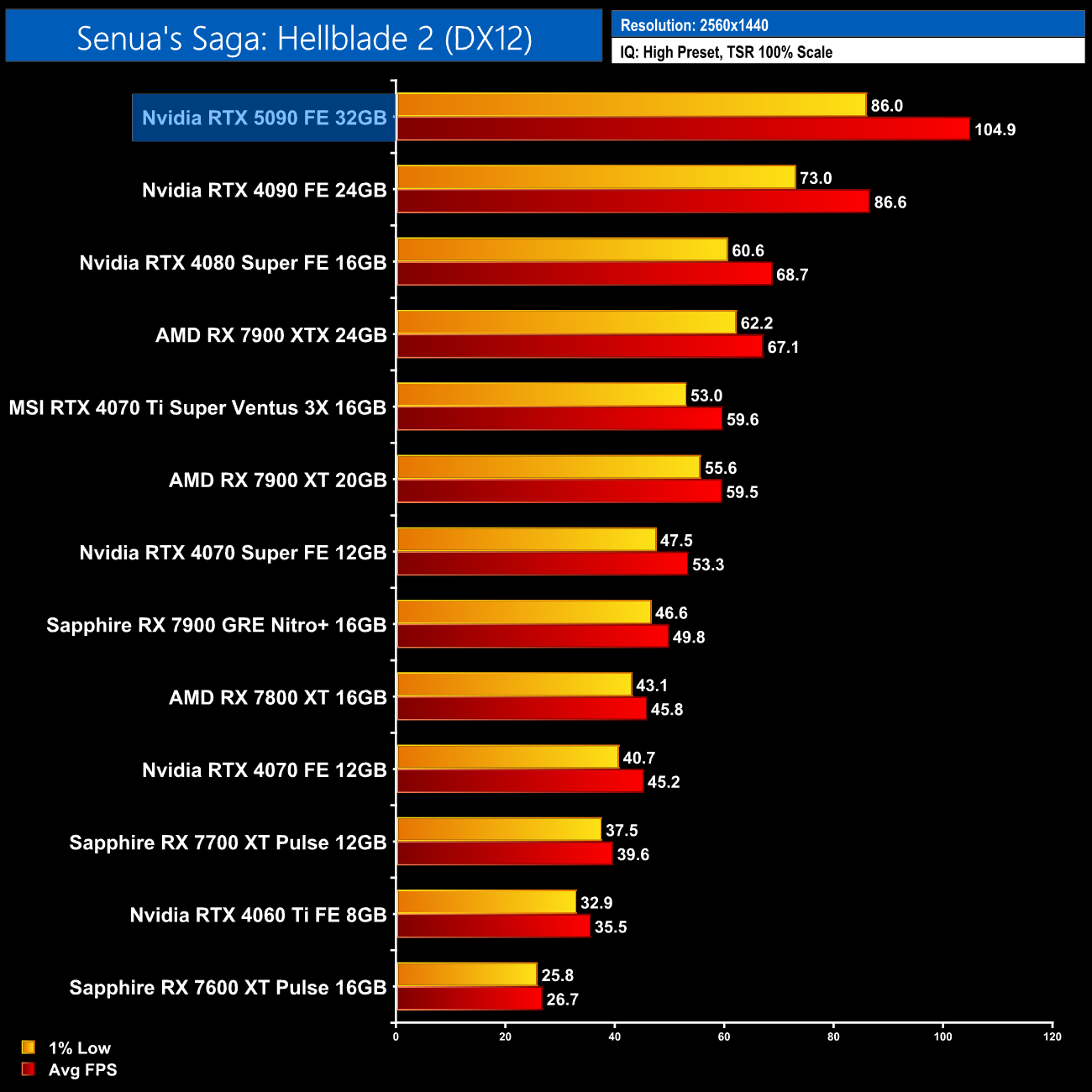 Despite being a very GPU-heavy Unreal Engine 5 title, Senua's Saga: Hellblade 2 shows lower performance scaling than I was expecting from the 5090. It's 21% faster than the 4090 at 1440p, for instance, and 56% ahead of the RX 7900 XTX.