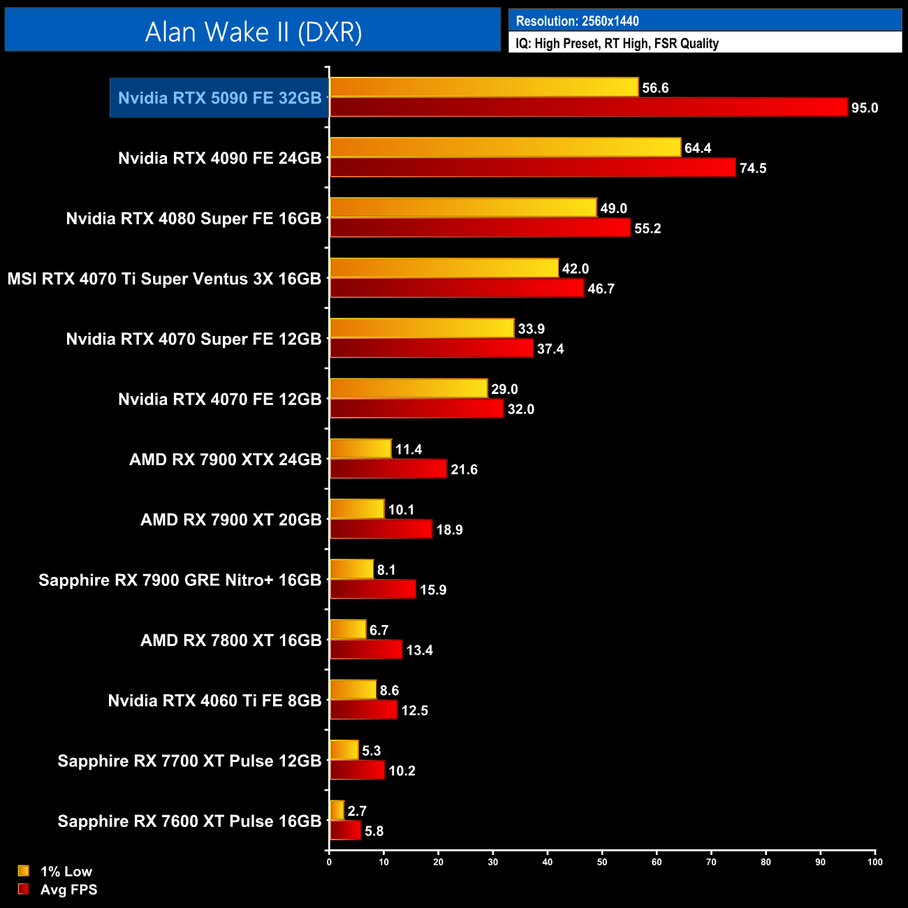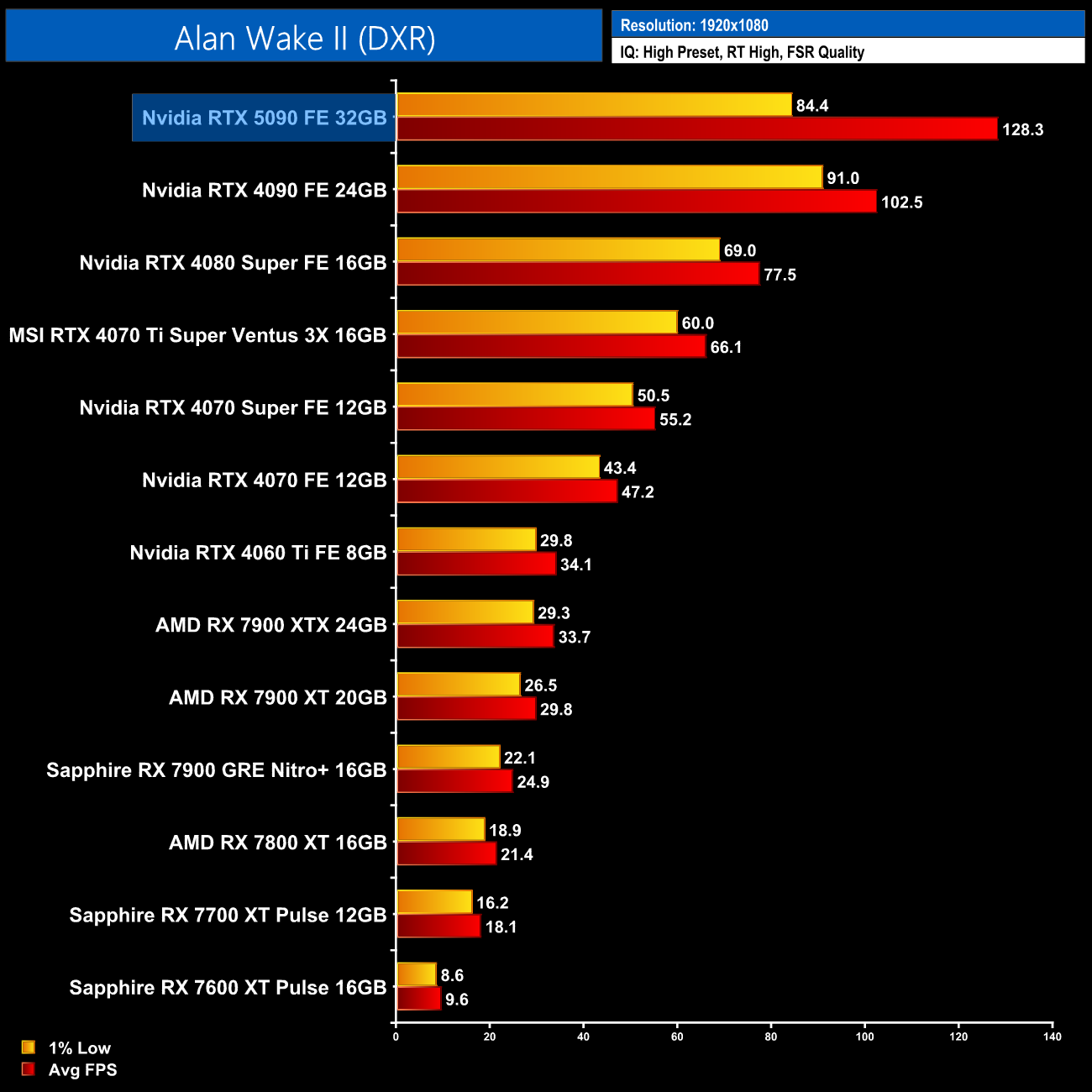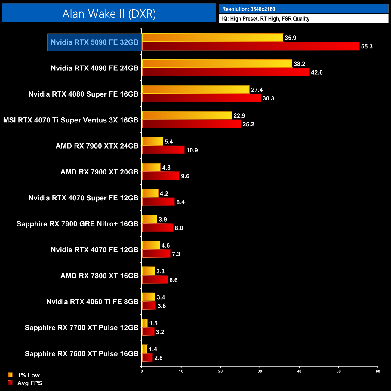 Moving onto ray tracing performance, there's a clear gulf in class when looking at Alan Wake 2 – only a handful of GPUs can deliver actually playable performance in this game with RT enabled. Of course the 5090 is top of the pile and it comes in 28% faster than the 4090, though the 1% lows are in need of fixing as we mentioned earlier in the review.