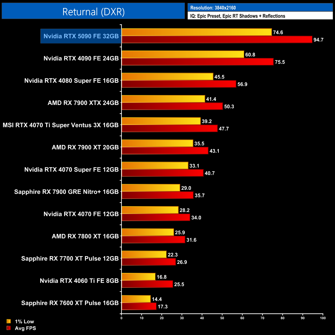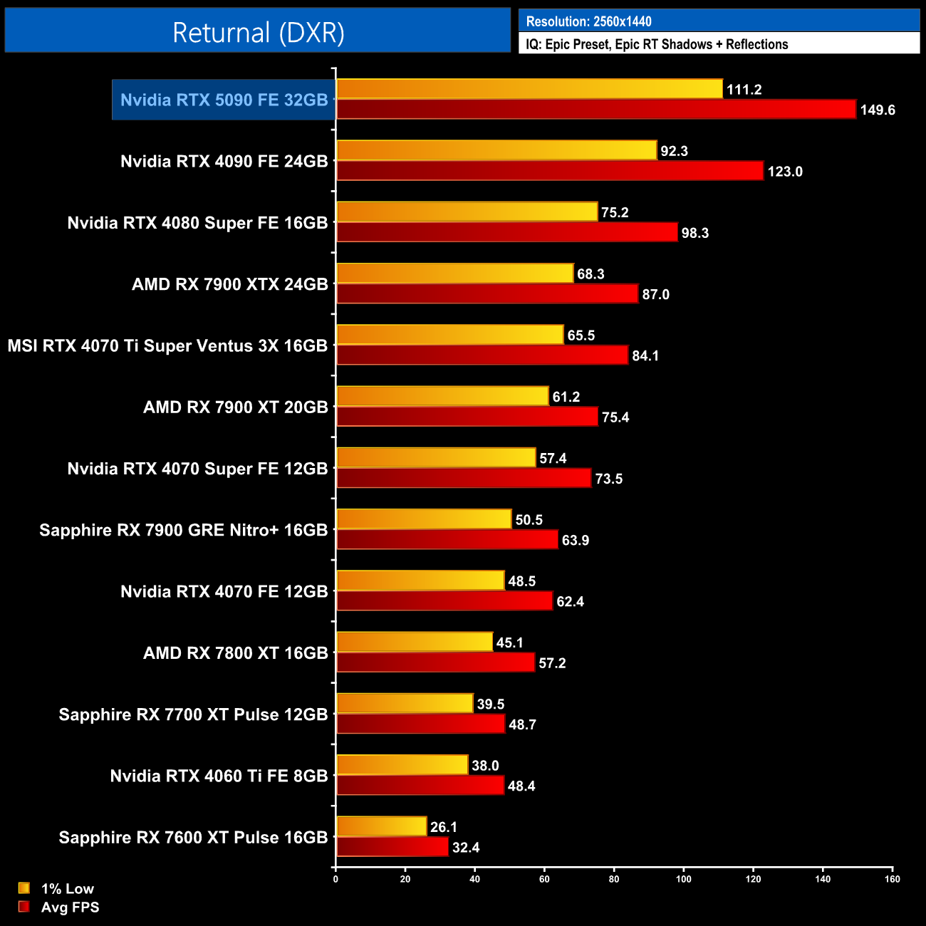 Next up is Returnal which only includes ray traced shadows and reflections, allowing the 5090 to cruise to 155fps on average at 1440p, though that's a relatively small 22% gain over the 4090.