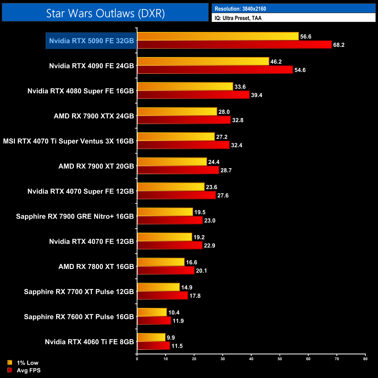 Lastly, we finish with Star Wars: Outlaws, a game with ray tracing at the heart of its engine. Even then, the 5090 displays relatively meagre gains over the 4090 at 1440p, given it is just 21% faster at 112fps on average.