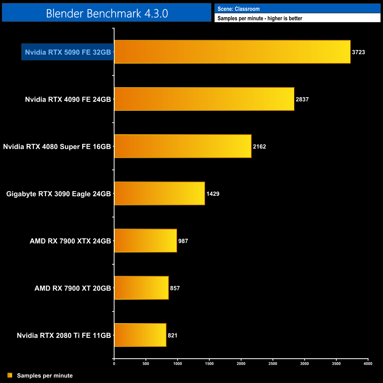 Blender benchmark makes a return, measuring the performance of the Classroom render scene. This shows a 31% gain over the 4090.