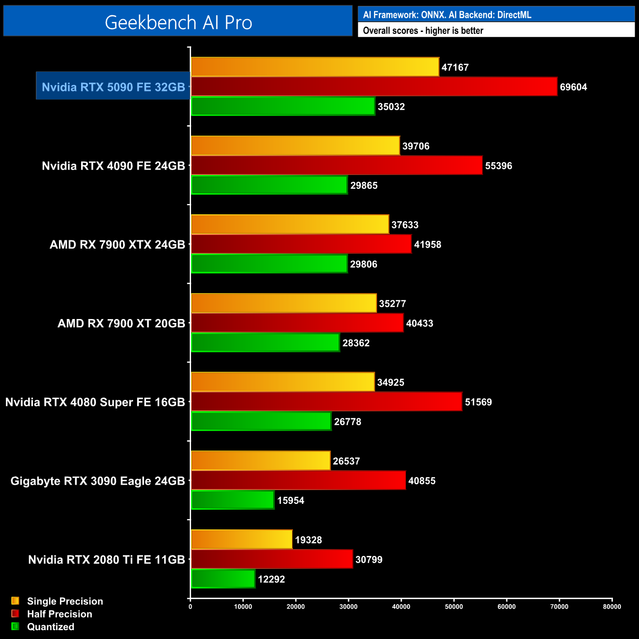 I also include the Geekbench AI Pro benchmark. The Half Precision metric shows the largest gains for the 5090, with a 25% increase, though the other two categories show improvements of less than 20% over the 4090.