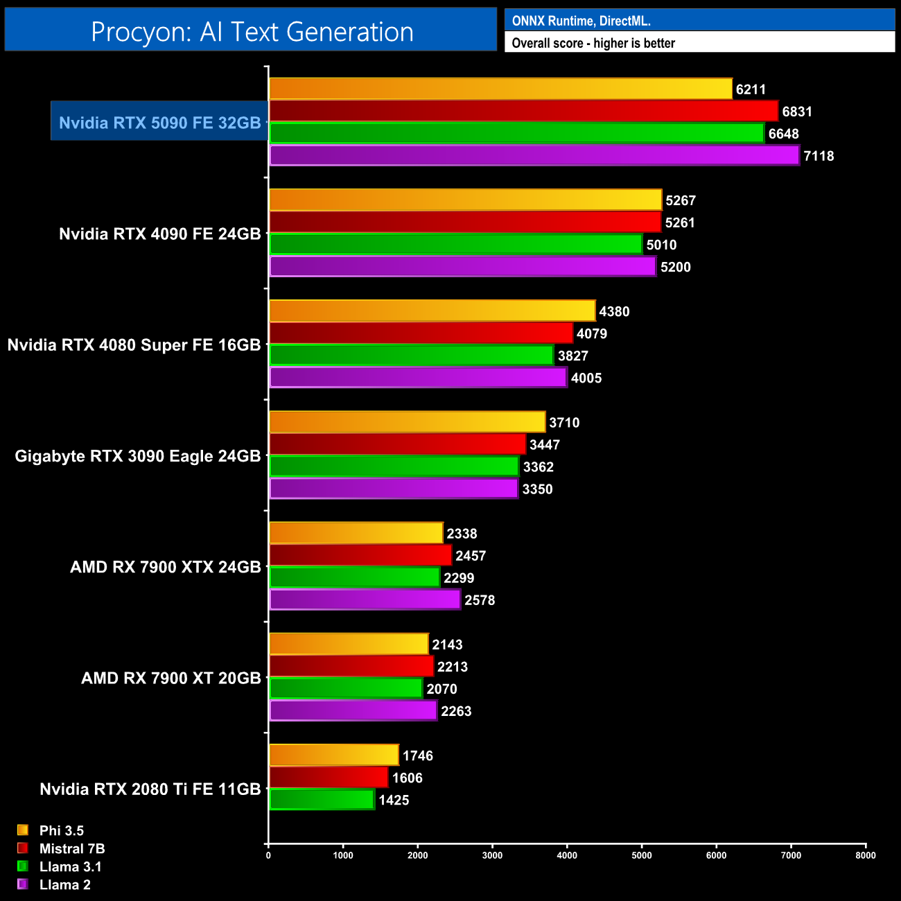 We also run the AI Text Generation benchmark designed to measure LLM performance, with four AI models we can test in Procyon. Gains over the 4090 varies slightly depending on the model, but Llama 2 performance has improved by 37% to pick out one example.