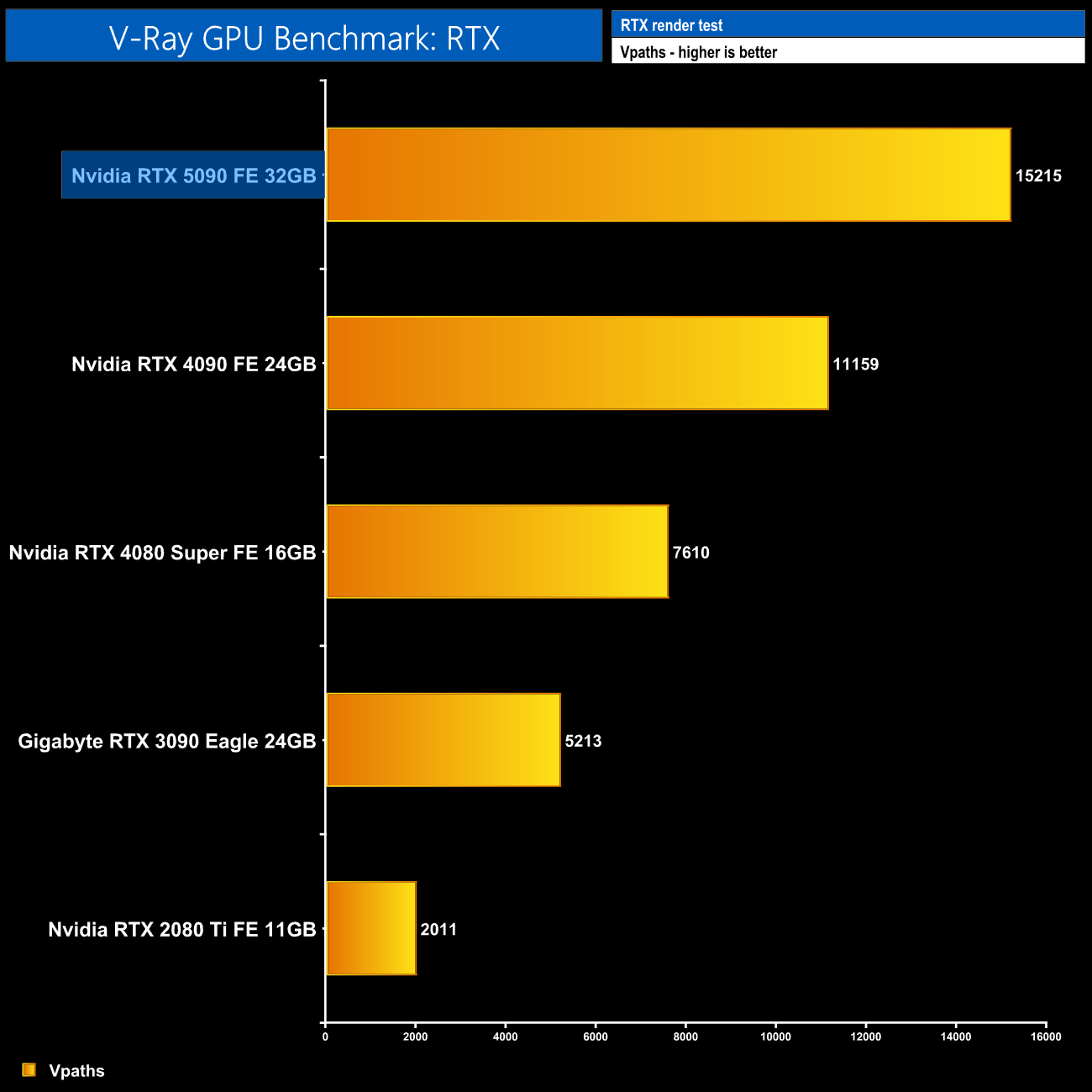 Finally, we run the V-Ray GPU benchmark, using the RTX path. This shows another 36% gain for the 5090 over its predecessor.