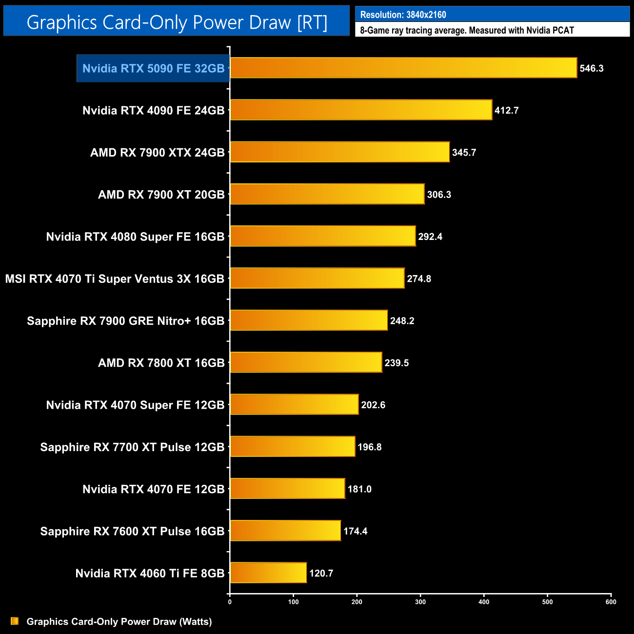 Here we present power draw figures for the graphics card-only, on a per-game basis for all twelve games we tested at 2160p (4K). This is measured using Nvidia's Power Capture Analysis Tool, also known as PCAT. You can read more about our updated power draw testing methodology HERE.