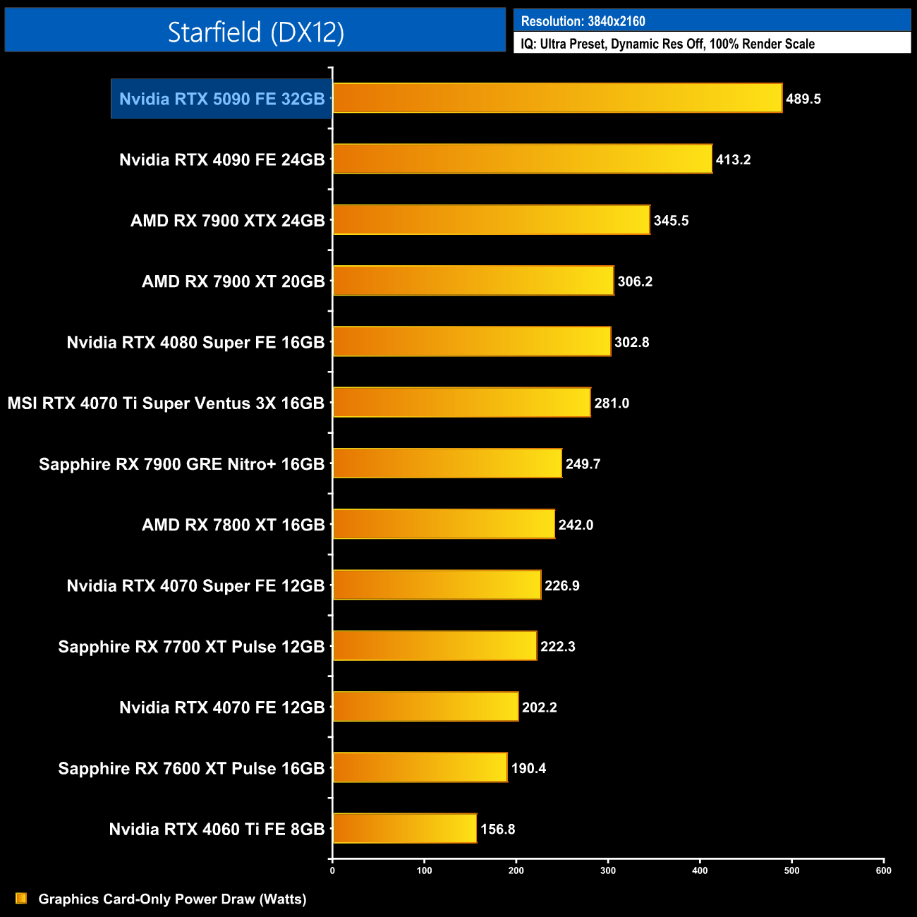 Up at 4K, power draw gets to its highest level from the RTX 5090, as we'd expect. Now a number of games pull well over 520W, though there's still a few that are closer to 400-450W. Even so, that is quite a remarkable amount of juice for a single graphics card, marking a 30% increase in power draw versus the 4090.