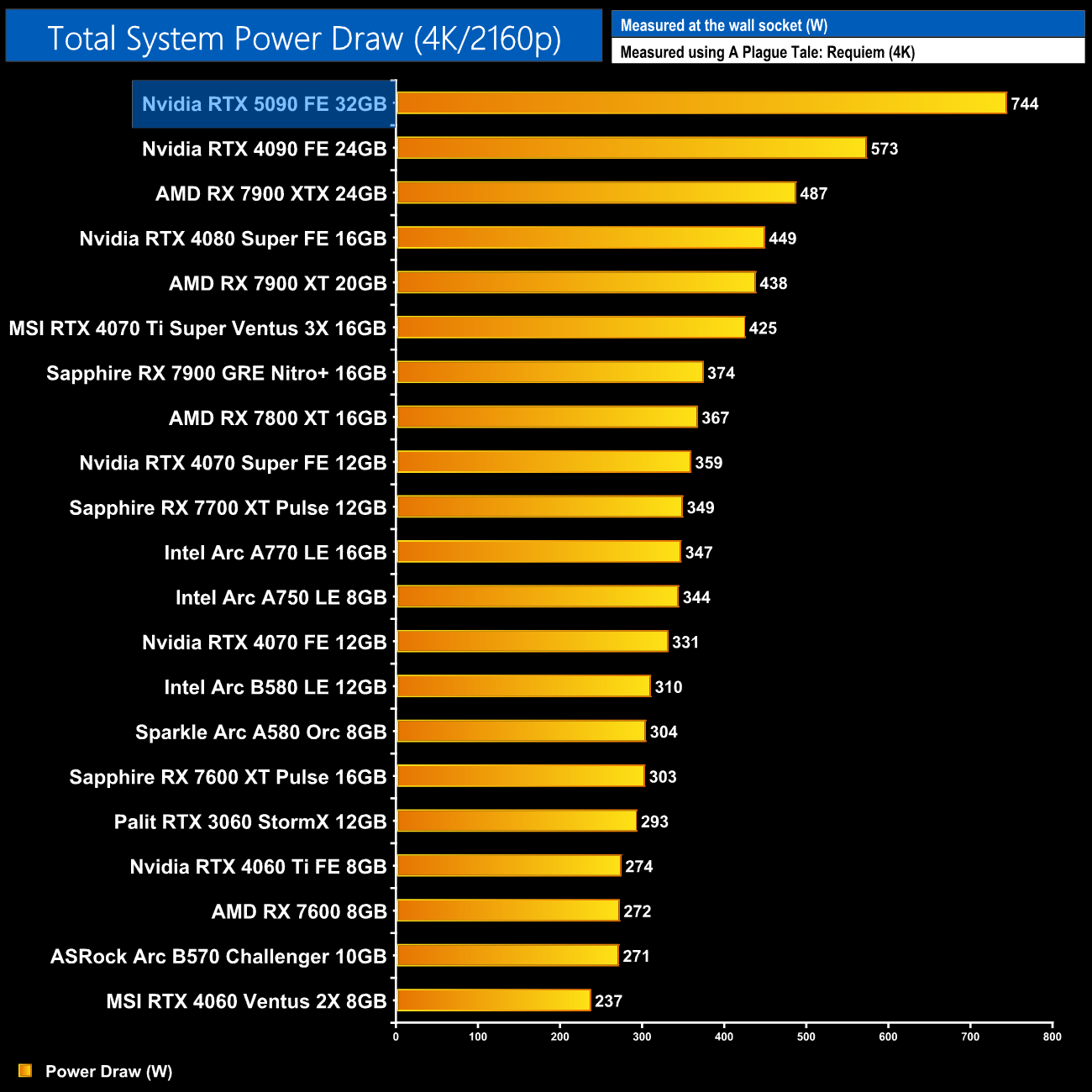 We measure system-wide power draw from the wall while running A Plague Tale: Requiem for 30 minutes (4K resolution).