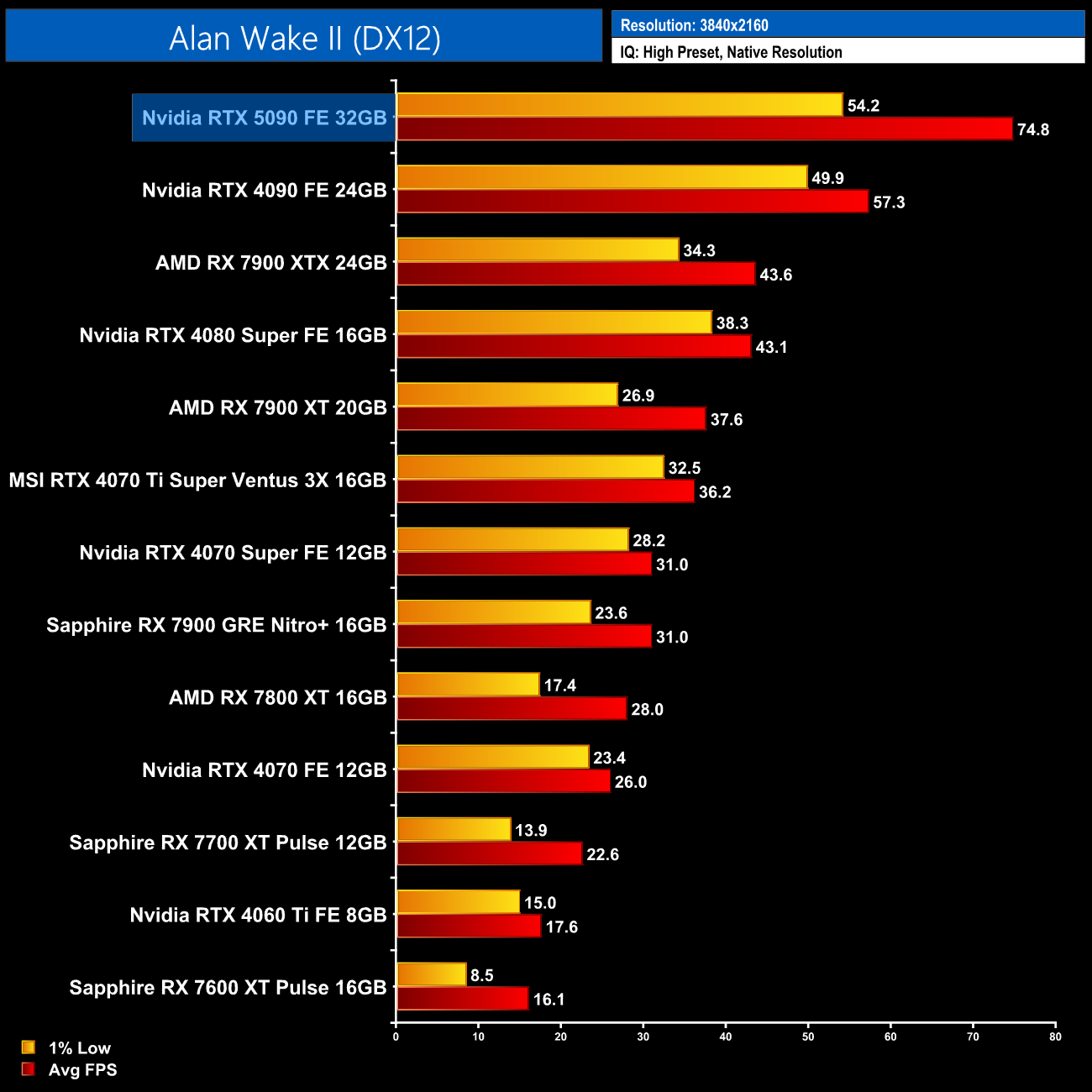 Kicking off with Alan Wake 2, we did encounter some frame time issues in this game which affect the 1% lows. We've spoken with a couple of other reviewers who also experienced similar, so it's likely a driver issue that just needs to be ironed out. The average frame rate still scaled in-line with our expectations though, with the RTX 5090 hitting 129fps at 1440p, making it 29% faster than the RTX 4090.