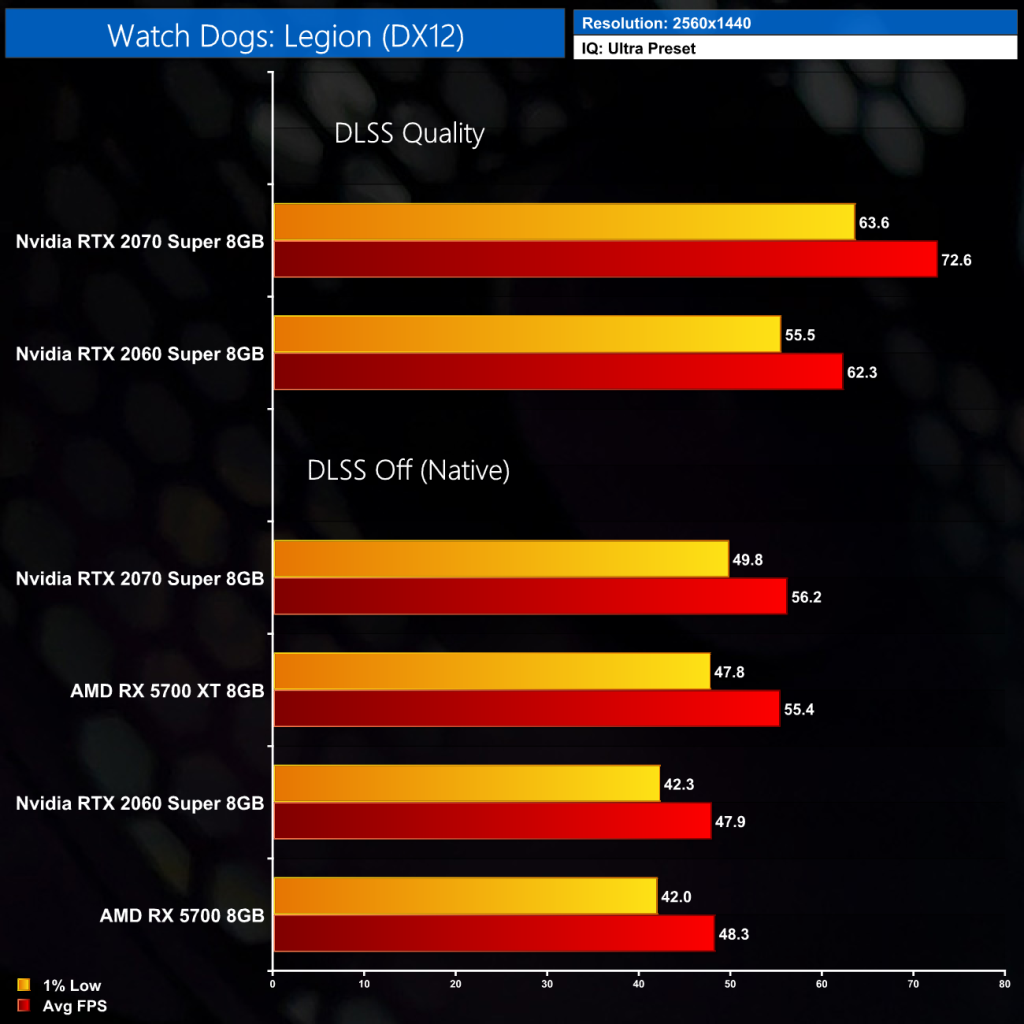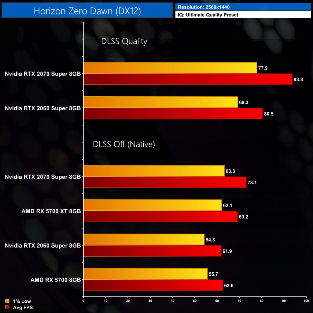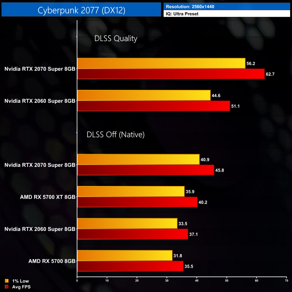 We did, however, test three games at 1440p resolution, showing the performance with DLSS off (i.e. a native 1440p resolution), and then with DLSS Quality mode enabled for the RTX 2060 Super and RTX 2070 Super. Even when using the best quality DLSS mode (therefore giving the smallest performance boost), frame rates still jumped by 28-39% depending on the game. With so many modern titles now supporting the technology as well, it becomes impossible to revisit these GPUs without placing a strong emphasis on the importance of DLSS.