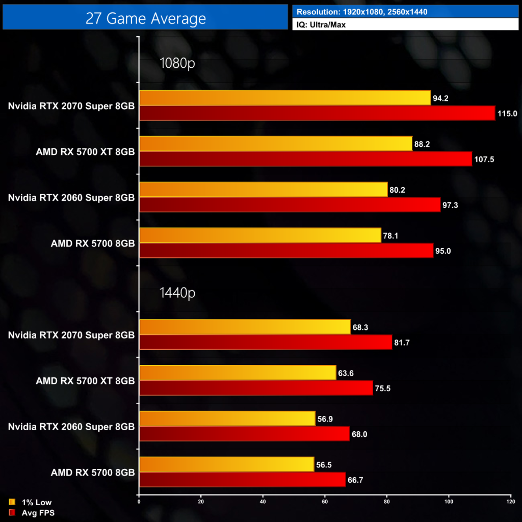 Taking a look at the average performance of all four GPUs across 1080p and 1440p resolution, we can see that the RTX 2070 Super is indeed faster than the RX 5700 XT, by 7% at 1080p and 8% at 1440p. The RX 5700 XT is itself 10% faster than the RTX 2060 Super at 1080p, and 11% faster at 1440p. Meanwhile, the RX 5700 is neck-and-neck with the RTX 2060 Super, proving just 2% slower on average at both 1080p and 1440p.