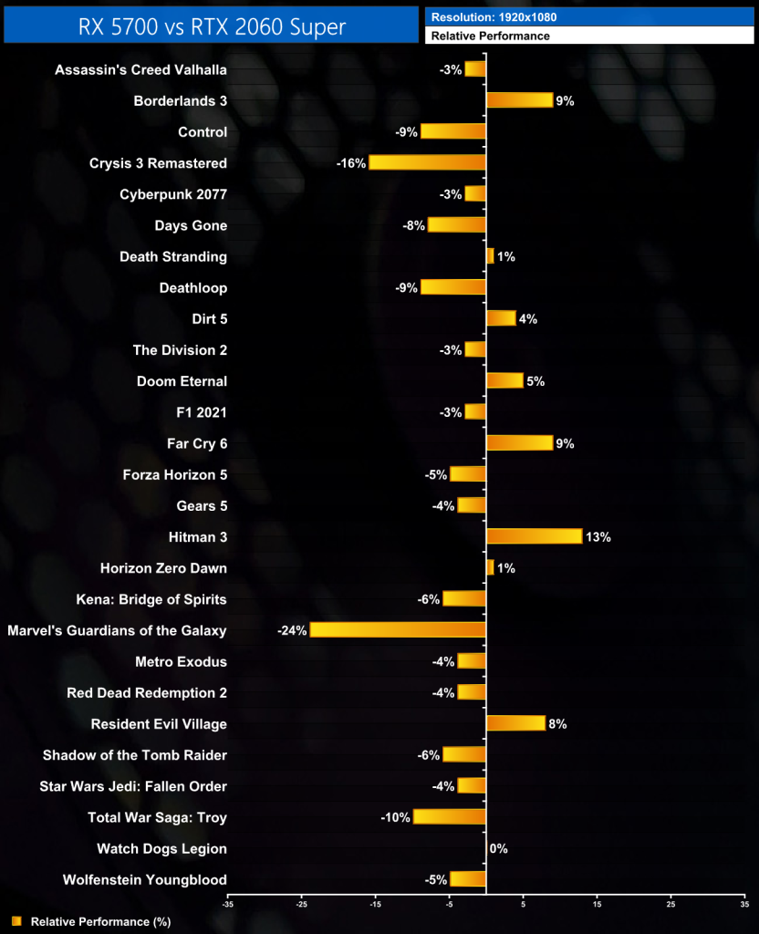 Starting with the RX 5700 XT's performance relative to the RTX 2070 Super at 1080p, we can see the RX 5700 XT is clearly the slower of the two. Not always by a lot, and it is still faster in six of the twenty-seven games we tested. There are a few significant losses however, most notably in Guardians of the Galaxy, while Unreal Engine 4 titles – including Days Gone and Kena: Bridge of Spirits – also show sizeable performance deficits.