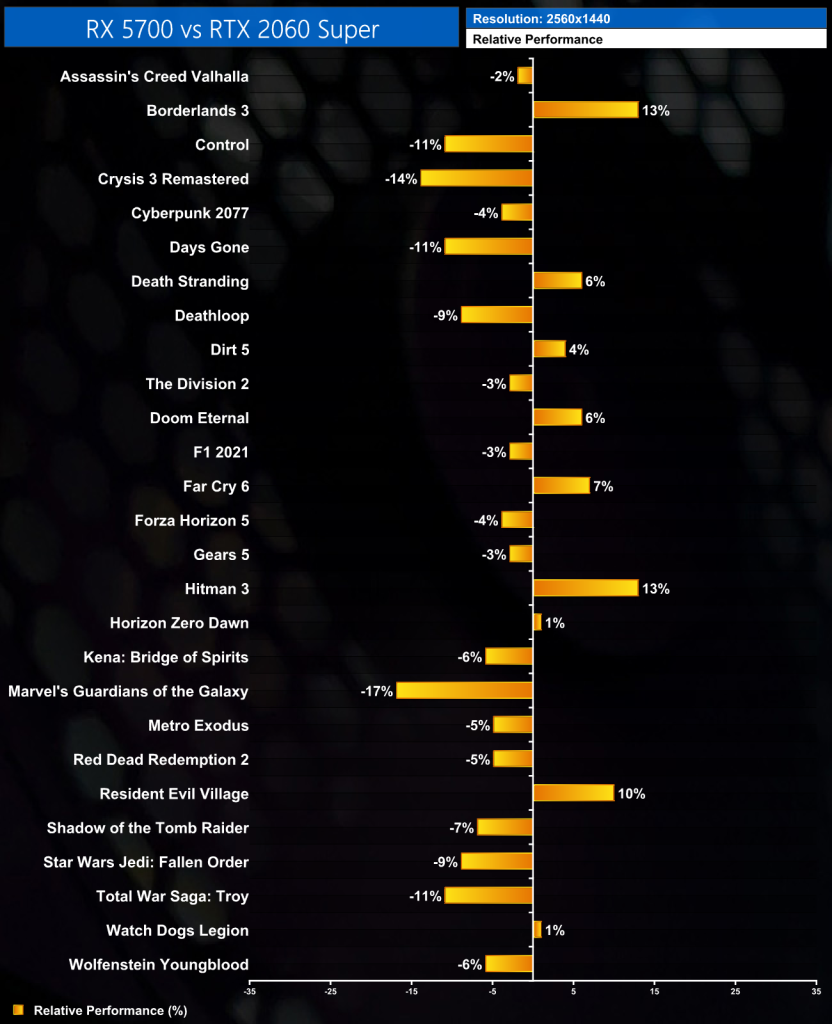The RX 5700 XT does slightly better against the RTX 2060 Super once we step up to 1440p as well. Here, in the two games where it is slower, the deficit is cut to just 6% in both instances. On the other side, the 5700 XT is 28% and 29% faster in Borderlands 3 and Hitman 3, respectively.