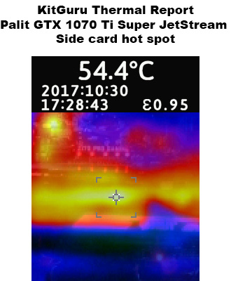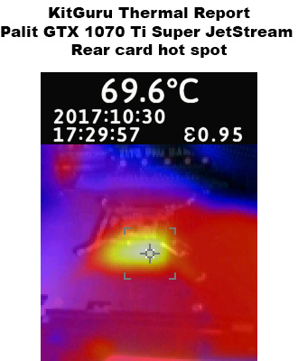Moving on to thermal imaging camera, the first thing to note is the higher 69.6C hotspot on the rear of the card. This is the area directly behind the GPU core, so it is not surprise to see it getting quite warm. If Palit had covered the back of the GPU with the backplate, I'd wager the hotspot would be lower as there would be more surface area for the heat to dissipate.
