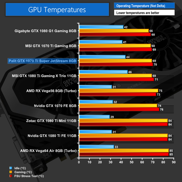 We first measure GPU temperature while the card is sat idling at the Windows 10 desktop for 5 minutes. Gaming GPU temperature is recorded by running the Deus Ex benchmark at 4K. As a maximum stress test, Fire Strike Ultra Stress Test is run 5 consecutive times and the cards’ GPU temperature levels are recorded.