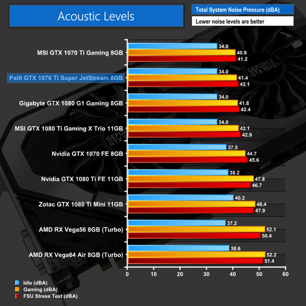 Barely coming in louder than the MSI Gaming 8G, the noise levels of the Palit 1070 Ti are very good. It also benefits from the ‘zero dB' mode so low-load tasks like web browsing can be done in silence.