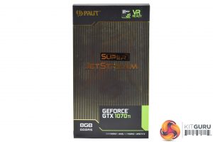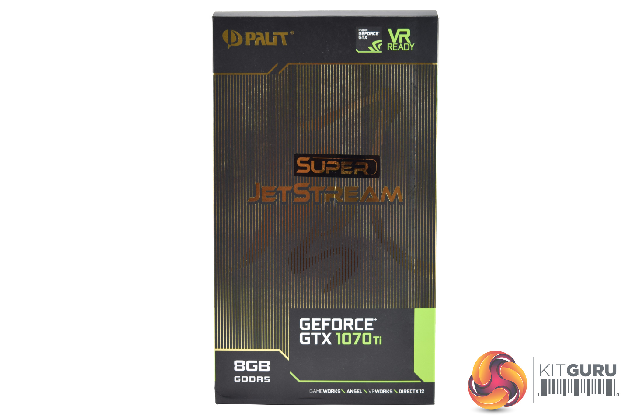 The Palit GTX 1070 Ti Super JetStream ships in a reflective gold box, with both the Palit branding and Super JetStream text written in gold lettering.