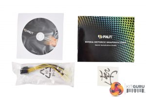 Inside, there is a pretty standard selection of accessories including 1x driver disc, 1x quick start guide, 1x PCIe power adaptor and 1x sticker.