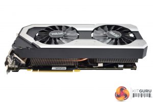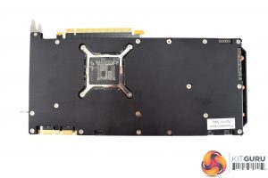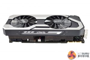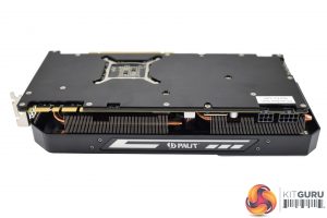 Turning to the top of the card, we can see Palit has fitted a very plain metal backplate. This should provide some rigidity, but I do wonder why they added in a cut-out directly behind the GPU core – we will have a look at thermals later in the review, but I would've thought having a full-cover backplate would help heat dissipate better.