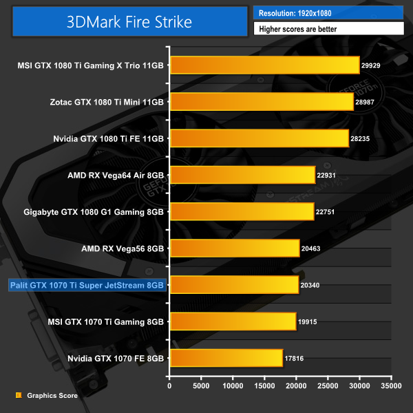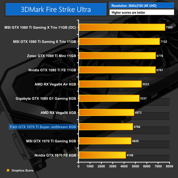 The Palit 1070 Ti gets off to a decent start with 3DMark – it edges ahead of the MSI 1070 Ti that we also reviewed for launch day, but the GTX 1080 is still a decent way ahead.
