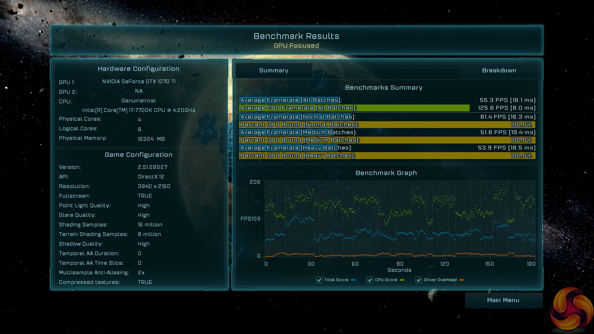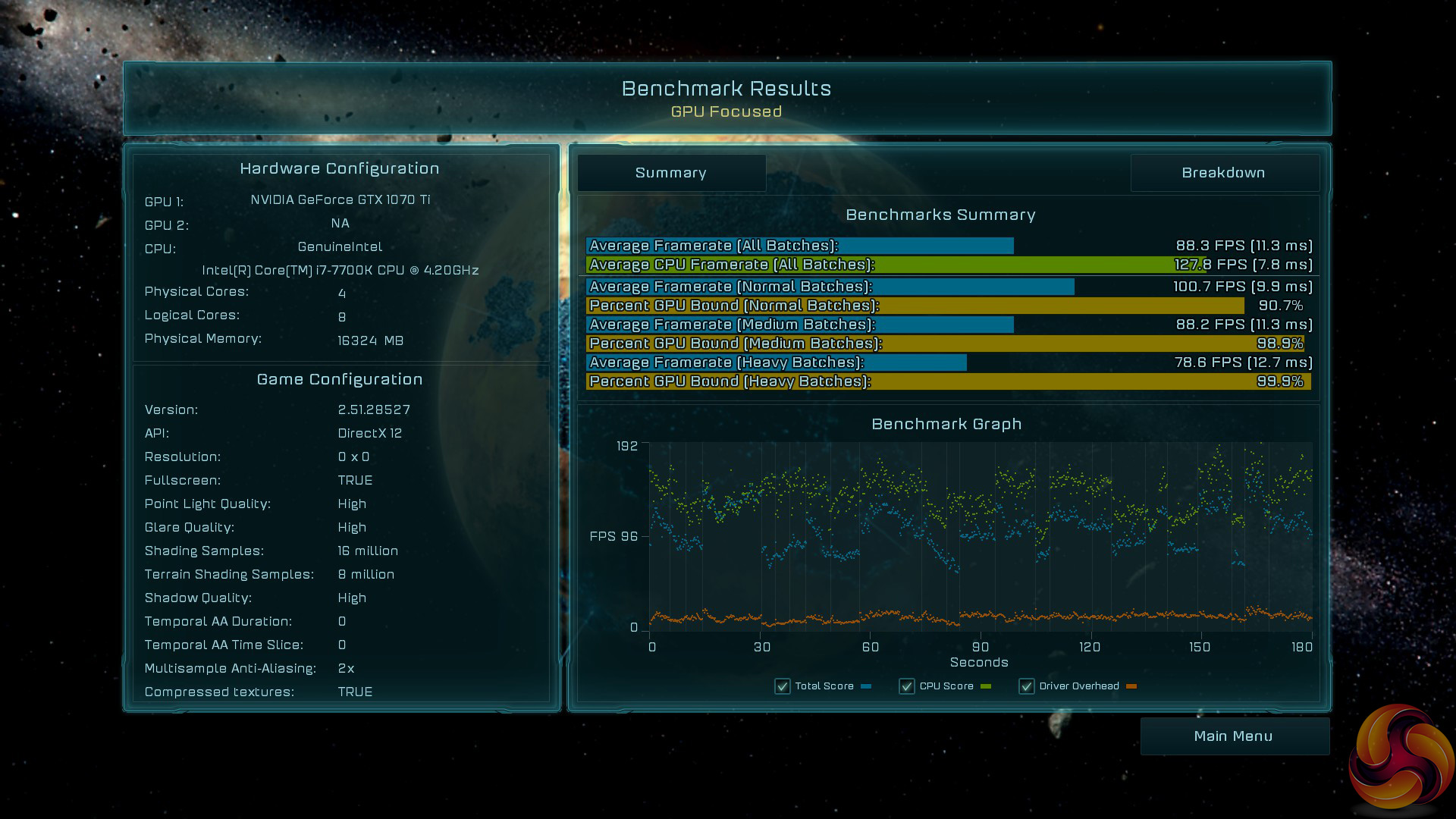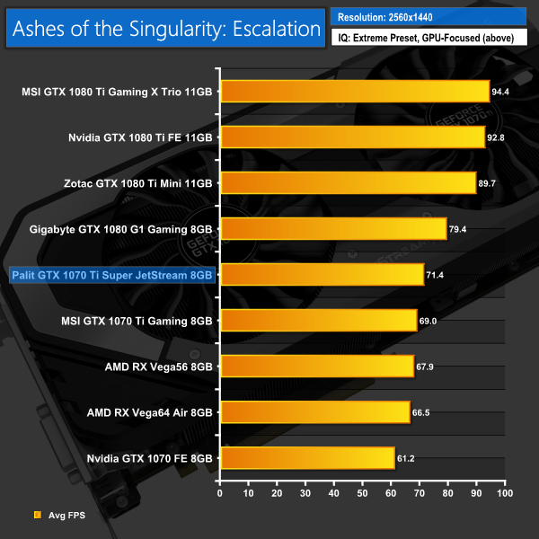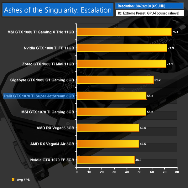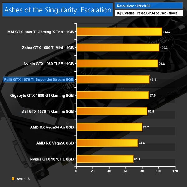 Ashes proved amenable to the Palit 1070 Ti – it actually just edge ahead of our Gigabyte GTX 1080 at 1080p. I looked into this closely as it was an interesting result, and it would seem the 1080p benchmark allowed the card to dynamically boost its frequency into the 1900MHz range – which then took the performance just past the 1080.