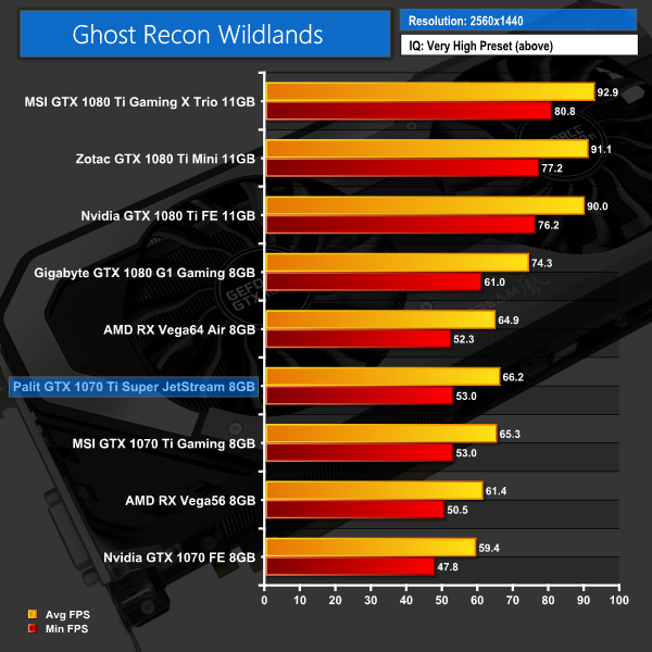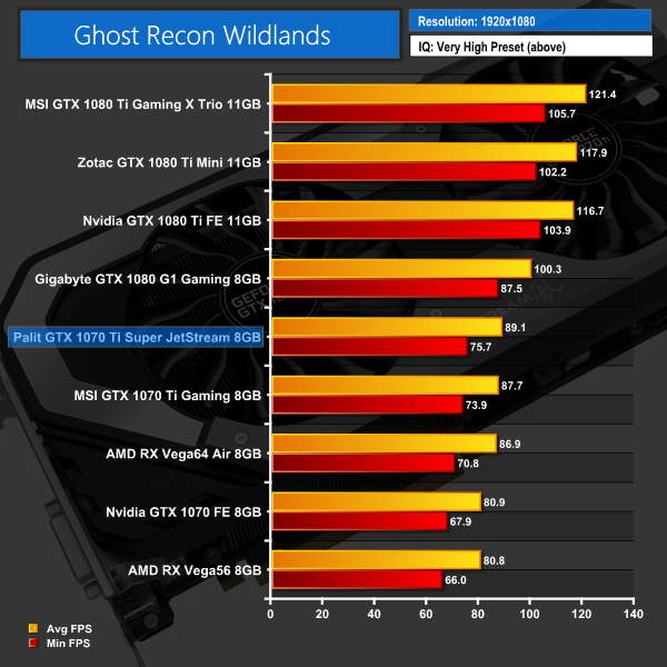 Wildlands is more favourable to Nvidia hardware so here we see the 1070 Ti stay ahead of Vega56 across all three resolutions tested. At 1080p, the Super JetStream even beats Vega64.