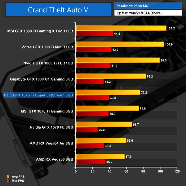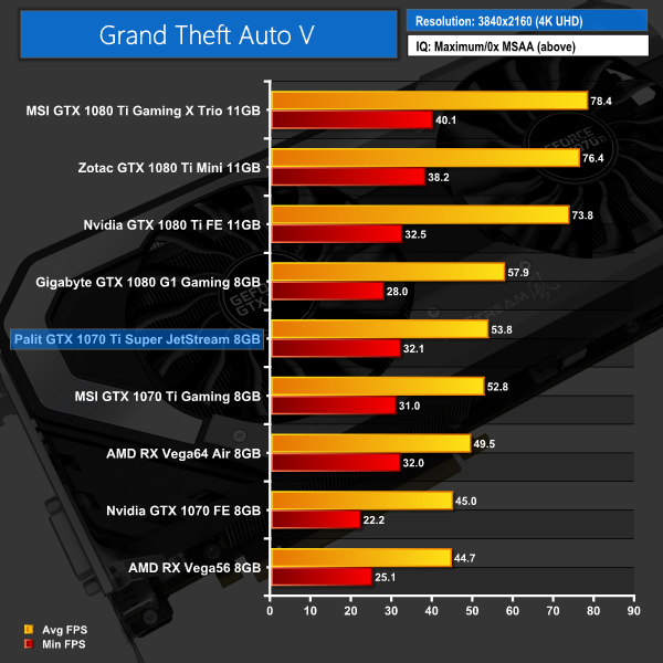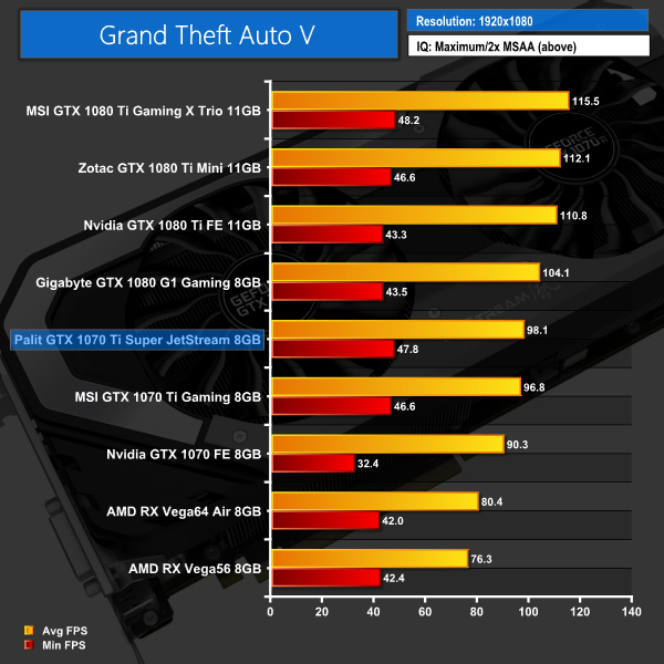 GTA V is another positive showing for the Super JetStream, with it outperforming both Vega cards as well as MSI's 1070 Ti offering.