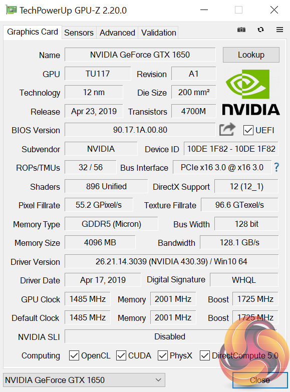 As mentioned, GTX 1650 reference spec has a boost clock of 1665MHz, but Palit has applied a 60MHz factory overclock to this card, though it is worth mentioning that the 4GB of GDDR5 memory is left at the stock 8Gbps.