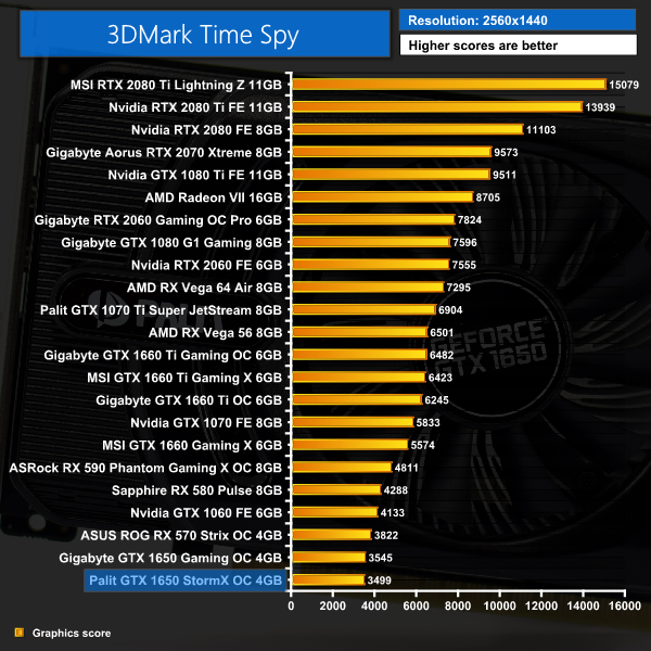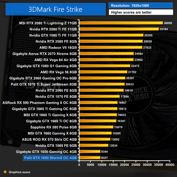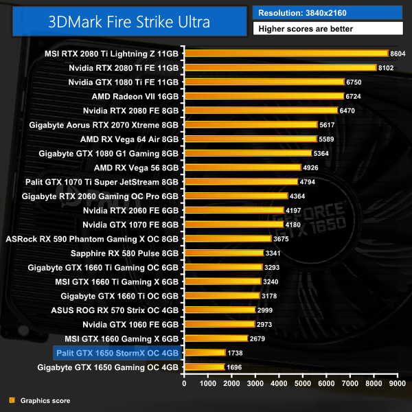 3DMark testing puts the Palit 1650 neck-and-neck with the Gigabyte 1650 Gaming OC we reviewed shortly after launch – there really is not much in it, and the Palit card even nudges ahead in the 4K Fire Strike Ultra test.