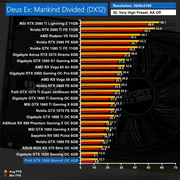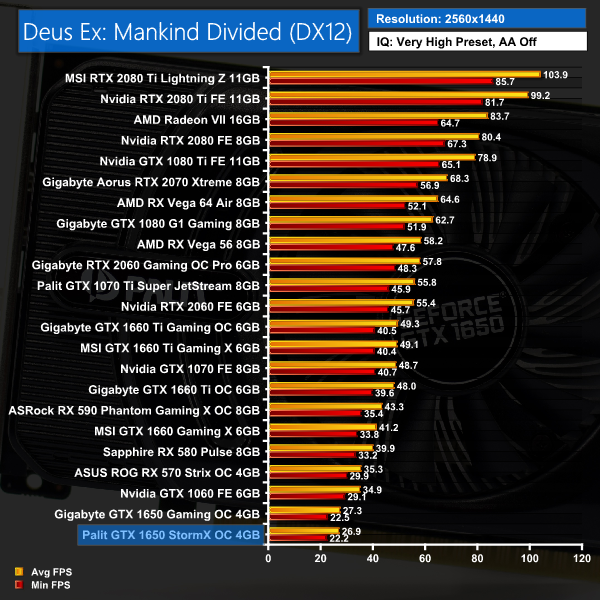 Deus Ex: Mankind Divided again shows a similar trend, with this Palit 1650 performing within a single frame of its Gigabyte 1650 counterpart. RX 570 is about 13FPS faster at 1080p, however.