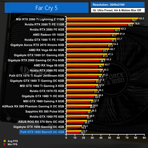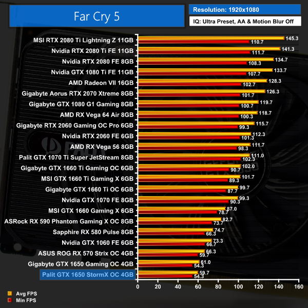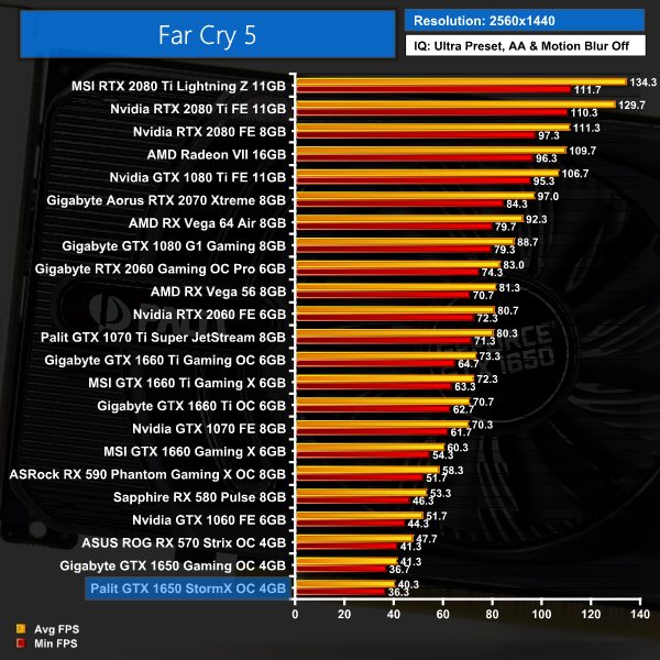 As expected, Far Cry 5 again has both our GTX 1650s within touching distance of each other – the biggest gap between these two cards is just 1.3FPS at 1080p. RX 570 isn't as far ahead here either, with a 6-7FPS lead at 1080p.