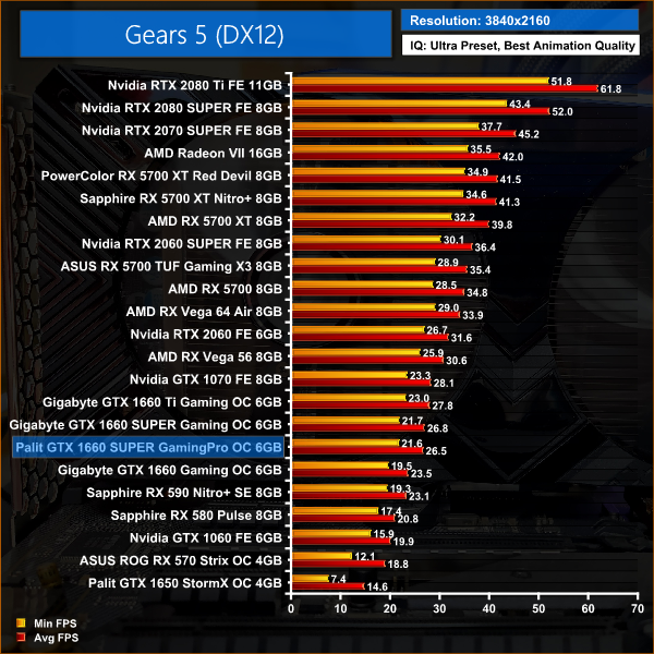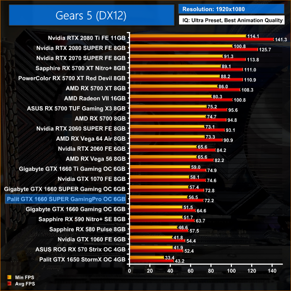 It's another 12% lead for 1660 SUPER over vanilla 1660 in Gears 5, while it is again 4% slower than 1660 Ti. Up against Vega 56, 1660 SUPER trails by 13%.