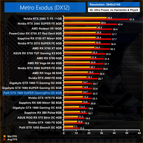 Metro Exodus seems to favour the higher-speed GDDR6 memory more and more as we increase the resolution – at 1080p, 1660 SUPER is 11% faster than 1660, but that lead stretches to 18% at 4K.