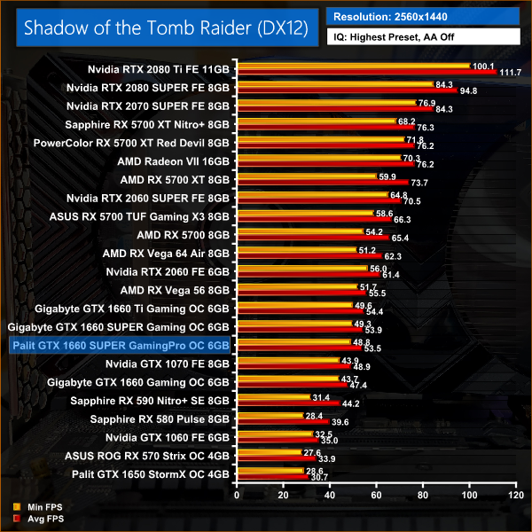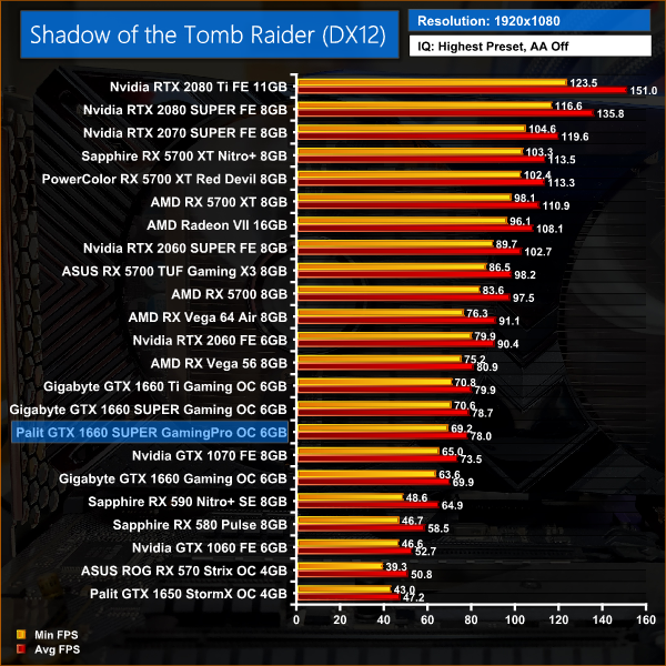 1660 SUPER beats 1660 by 13% in Shadow of the Tomb Raider, and also closes the gap significantly on Vega 56 in this title – it's just 4% slower here.