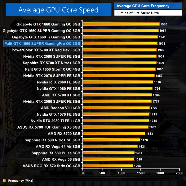 With a rated boost clock of 1830MHz, the GamingPro OC does very well to exceed this by 98MHz on average. It's about 30MHz slower than our Gigabyte 1660 SUPER, the review of which has also gone live today, which explains the small performance advantage we saw for the Gigabyte card during our games testing.
