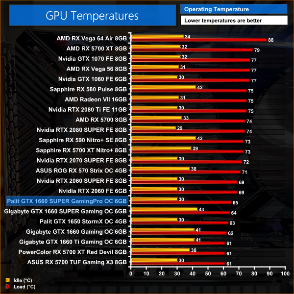 Despite the smaller heatsink Palit has used for the GamingPro OC, thermal performance is very good, with the GPU peaking at 65C during our 30 minute stress test. This is just 1C hotter than the triple-fan Gigabyte Gaming OC 6G we have also reviewed today, so that is very good news for Palit.