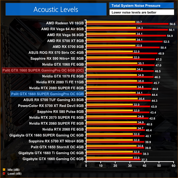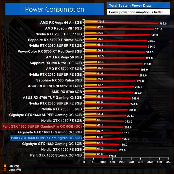 The GamingPro OC did well to handle the extra frequency from the GPU. It ran 2C hotter which is nothing to worry about, though noise levels did rise to 46.5dB which is getting a little loud for my tastes, but it's still not terrible. Lastly, power draw jumped up by 13W, so a pretty negligible result there as well.