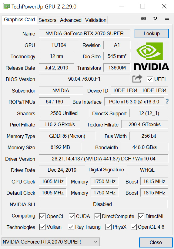 Just confirming what we touched on earlier – RTX 2070 Super uses a cut-down version of Nvidia's TU104 GPU, the same GPU used for the vanilla RTX 2080 when it launched back in September 2018. Where the full TU104 sports 48 Streaming Multiprocessors (SMs), the cut-down version used for 2070 Super consists of 40 SMs, each housing 64 CUDA cores, for a total of 2560.