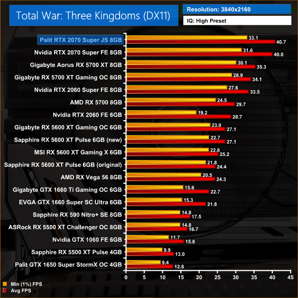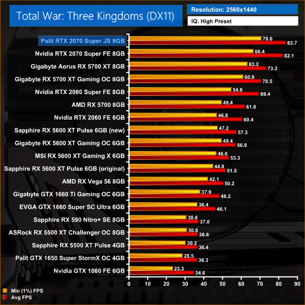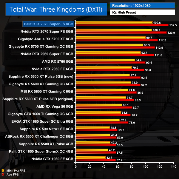 Our last game of the day is Total War: Three Kingdoms. Once more, at 1440p we can see the Palit JS outperforming Nvidia's 2070 Super Founders Edition by 2%, while the JS is also 19% faster than Gigabyte's Gaming OC 5700 XT, and 14% faster than the Aorus 5700 XT.