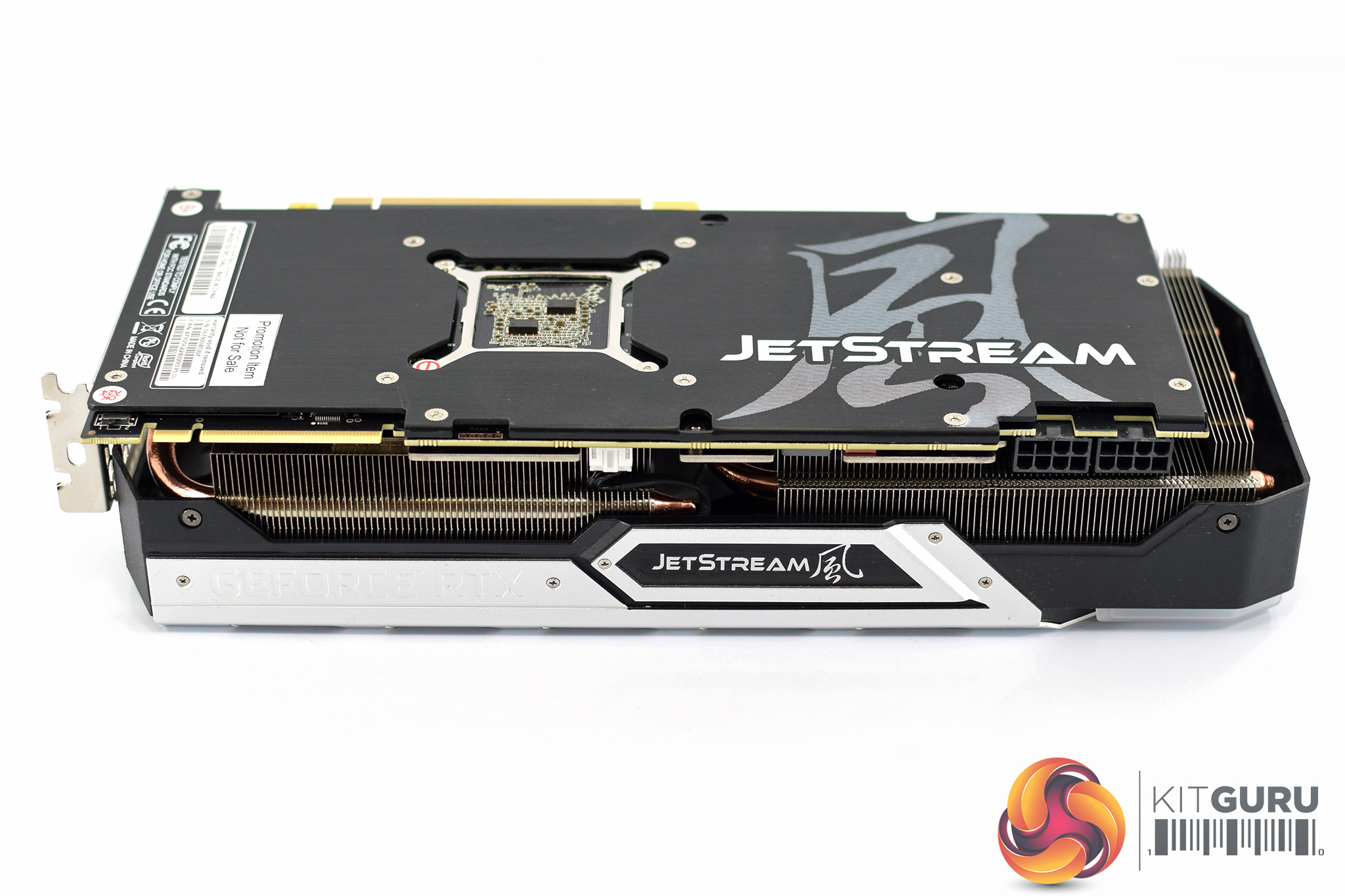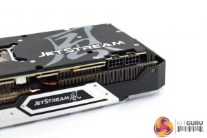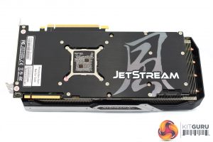 As for the backplate, this is a brushed metal plate with a single cut-out behind the GPU core. The JetStream logo takes up most of the right-hand side of the backplate.