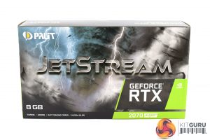 The Palit RTX 2070 Super JS ships in a visually appealing boxing, with the front designed like a lightning storm – it's certainly eye catching.