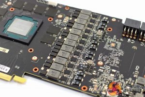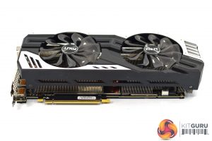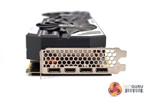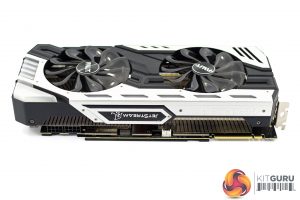 On the front side of the card, we can see the JetStream logo written in silver text, surrounded by one of those metal plates we mentioned earlier. Right next to the I/O bracket we can also just about make out the dual-BIOS switch. Here there is the choice of BIOS 1 or BIOS 2 – BIOS 1 is the ‘OC profile' and is the default setting, while BIOS 2 reverts to reference clocks with a slower fan curve. We test both BIOS later in the review.