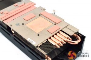 As for the cooler, once again as far I can tell this is the same unit used for both the 2060 Super JS and 2080 GameRock cards. It is comprised of two fin stacks which are connected by 5, thick 8mm copper heatpipes. The GPU die contacts with a copper baseplate, while that is surrounded by a larger plate used to cool the memory. Another separate plate is positioned to the side to cool the VRM.