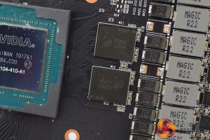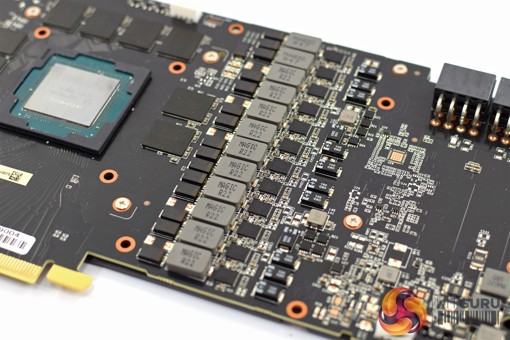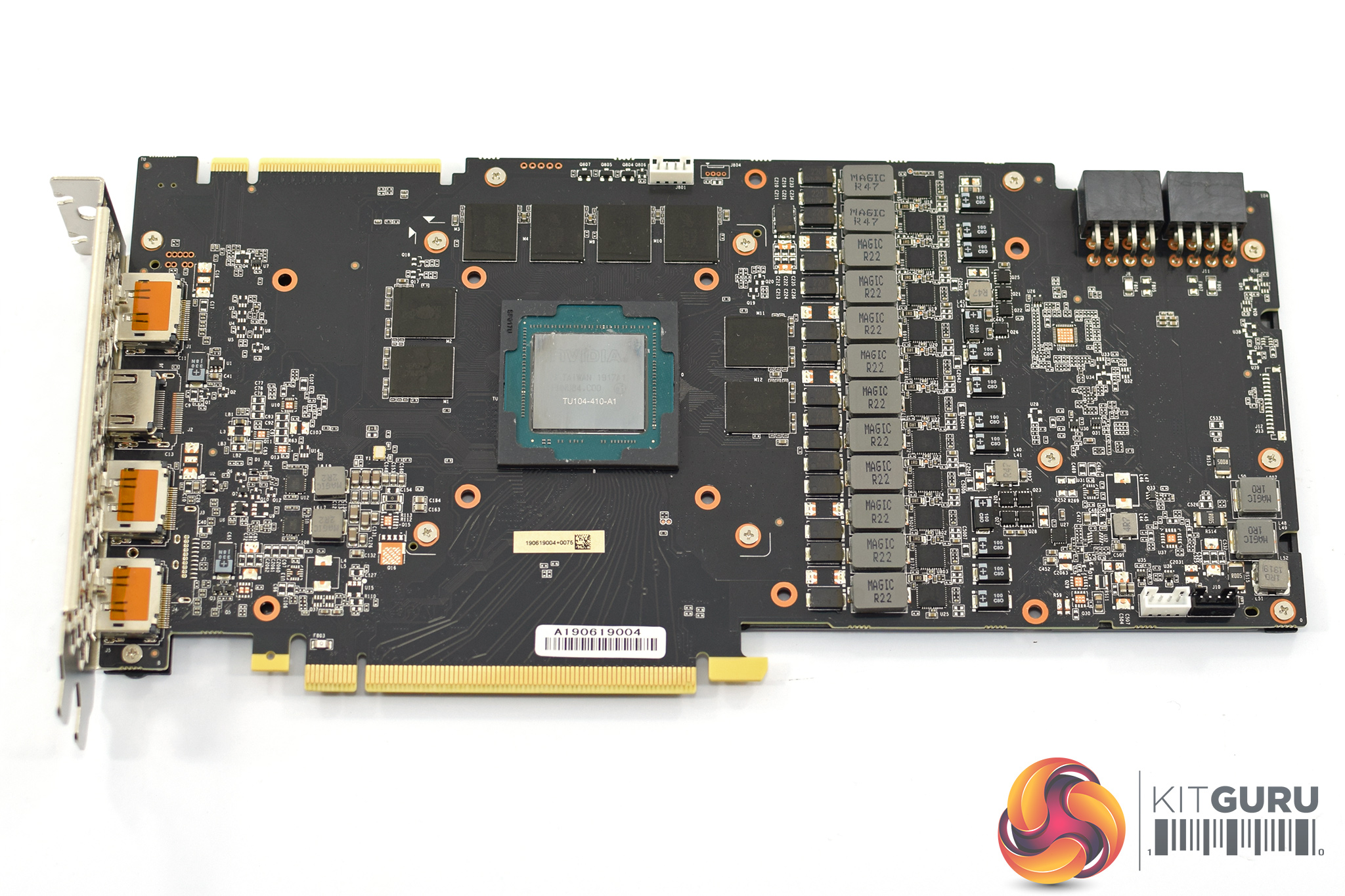 Opening up the card reveals the PCB, with Palit opting for a 10+2 phase VRM with this model – this appears to be a very similar, if not identical, design to Palit's RTX 2080 GameRock, which of course makes sense since RTX 2070 Super and RTX 2080 both use the TU104 GPU. Memory is provided by Micron's D9WCW modules, and the GPU die is labelled ‘TU104-410-A1'.
