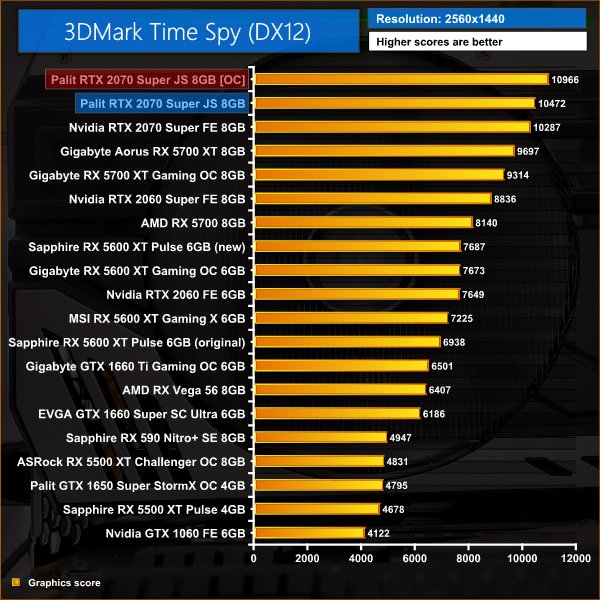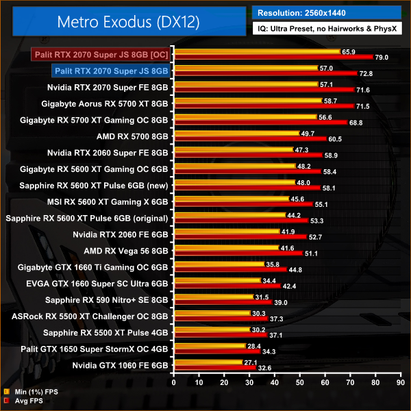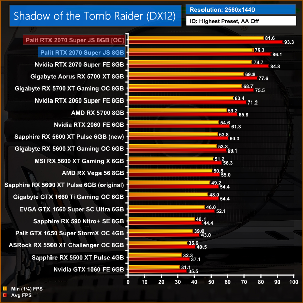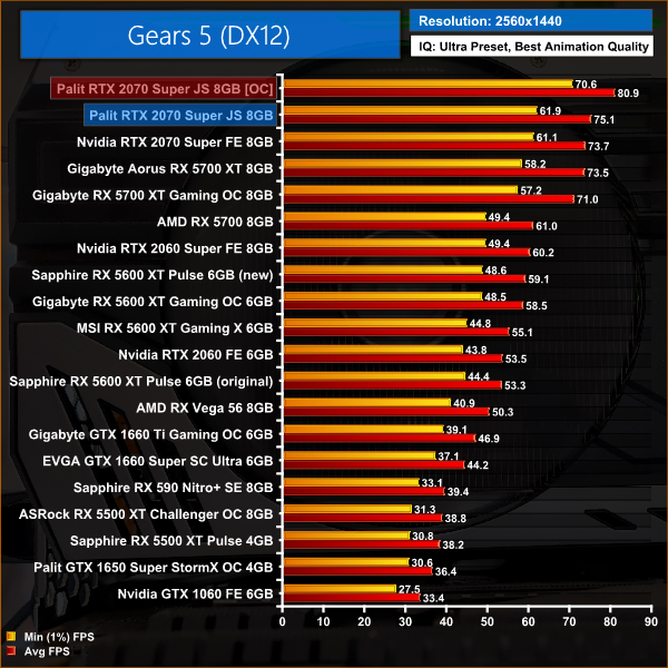 In the games we retested at 1440p resolution, this extra frequency saw our frame rate improve by 8 or 9% in our testing. This is overall pretty much as expected for a 2070 Super.