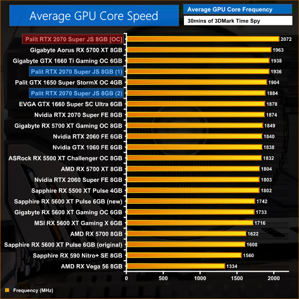 This resulted in the Palit JS averaging just over 2070MHz, a real-world gain of 136MHz based on our stress test.
