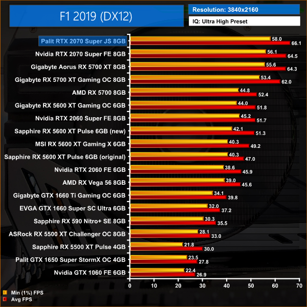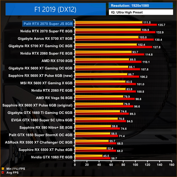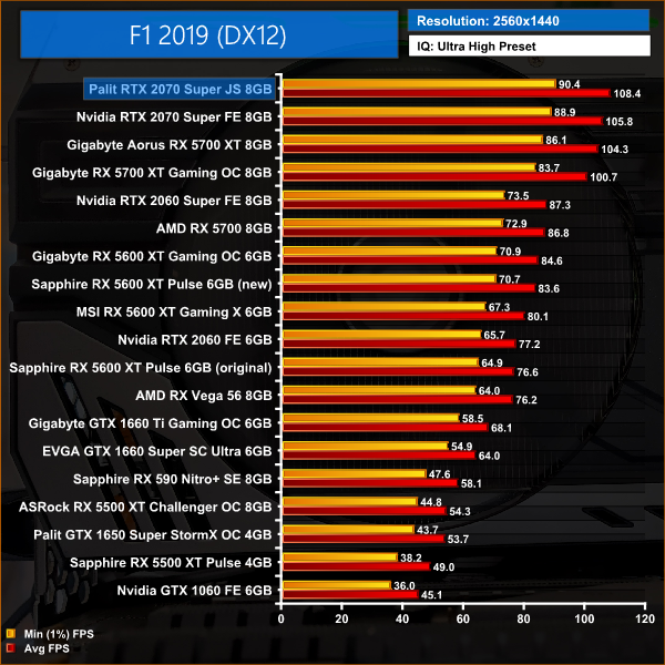 F1 2019 shows a slightly larger lead for the Palit JetStream over Nvidia's Founders Edition, but it's still not much of a victory – at both 1440p and 4K, the Palit is 2% faster on average. Compared to Gigabyte's RX 5700 XT Gaming OC, at 1440p the Palit is 8% faster.